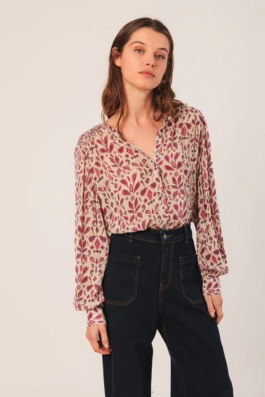 Esta camisa de hombro encajado y detalle en smock, es de fit relajado con un tejido liviano en georgette de viscosa sostenible.