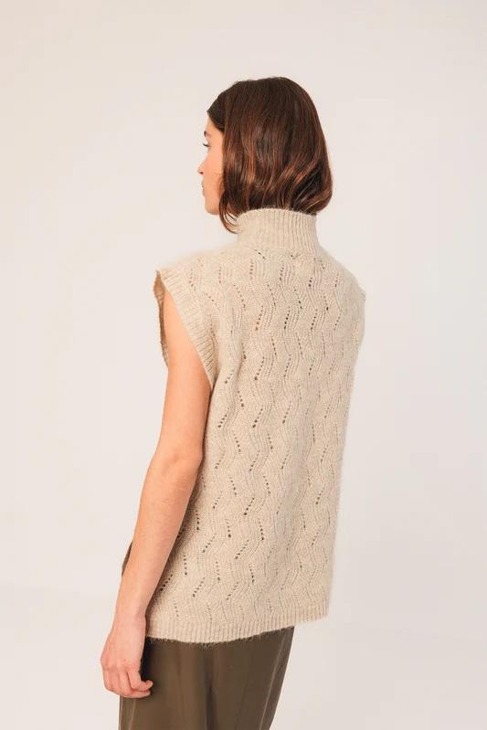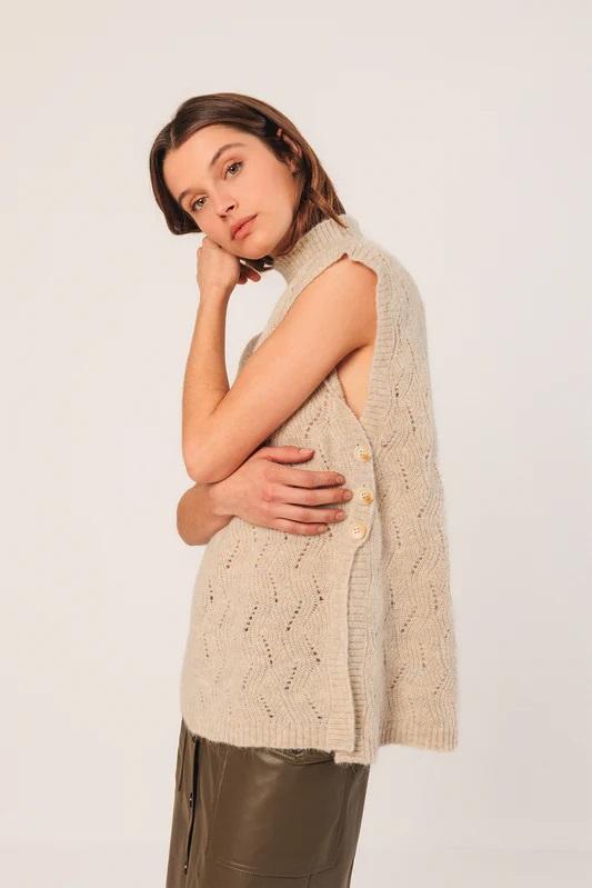 Chaleco de punto fantasía de punto con alpaca, con cuello subido y cierre de botones en los laterales. También tiene aberturas y es perfecta para vestirla encima de una camisa romántica.