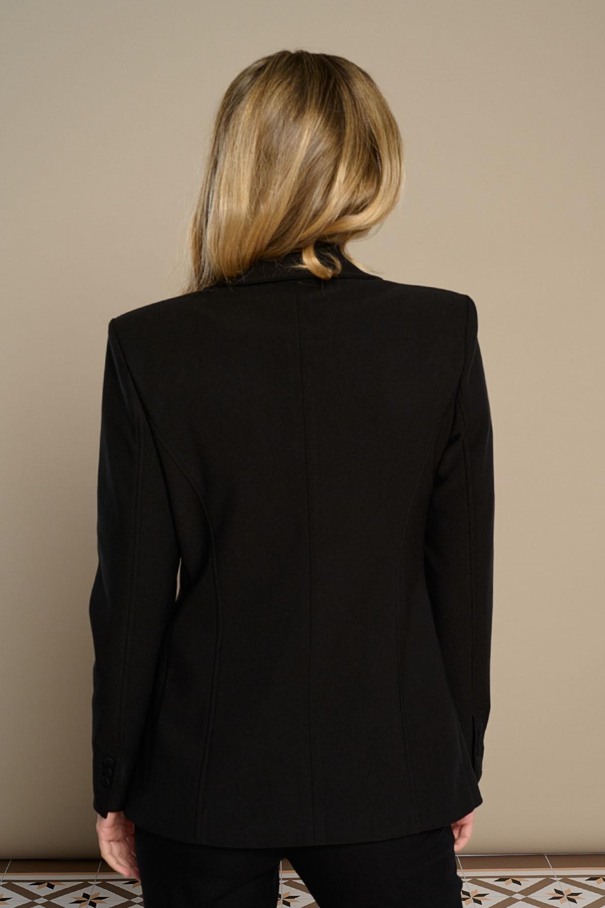 Chaqueta estilo blazer con detalles de strass negro en hombreras y solapa. Cierre con botones frontales. Bolsillos en laterales. Forro interior.