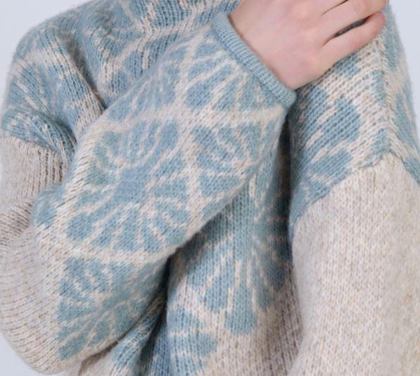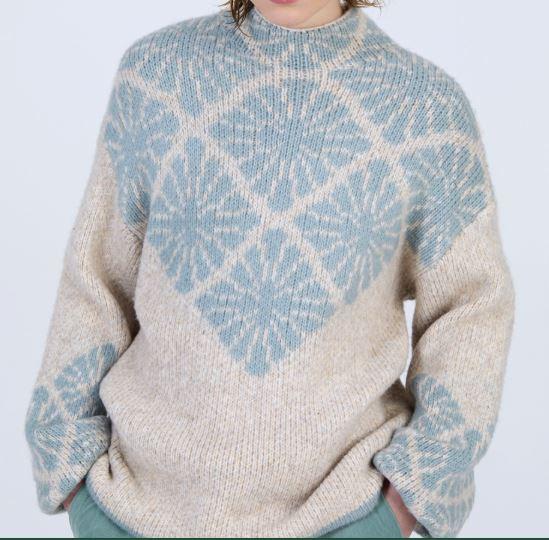 Jersey de punto con mezcla lana. Cuello chimenea y manga larga abullonada. jacquard motivos geométricos.