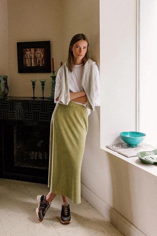 La falda ideal para el entretiempo. Tiene la cintura engomada, el corte recto ligeramente ajustado y una abertura lateral. Su composición tipo toalla la convierte en la falda comfy de la temporada.