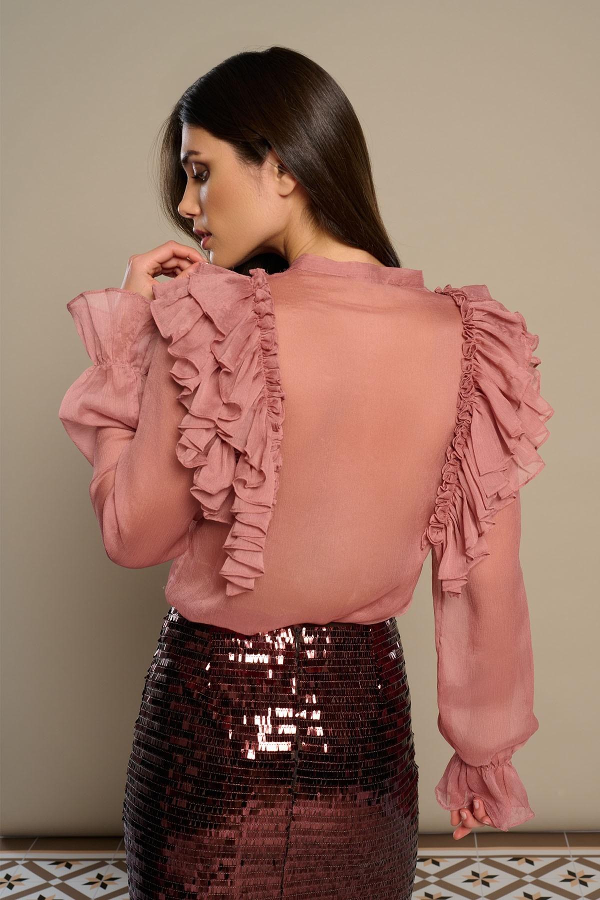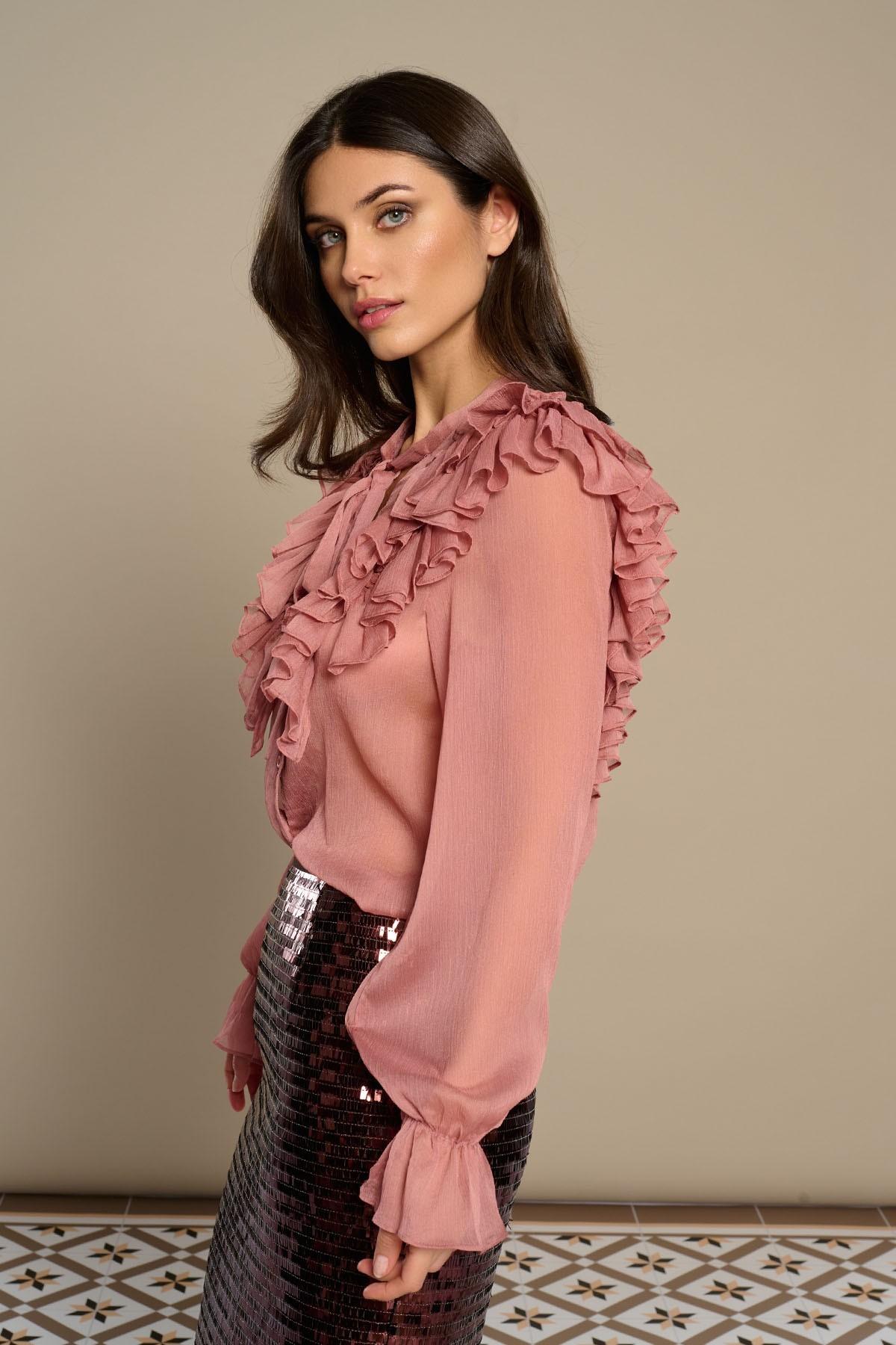 Blusa de cuello redondo y manga larga. Volantes en frontales y hombros. Tejido vaporoso. Cierre con botones frontales y lazo en cuello.