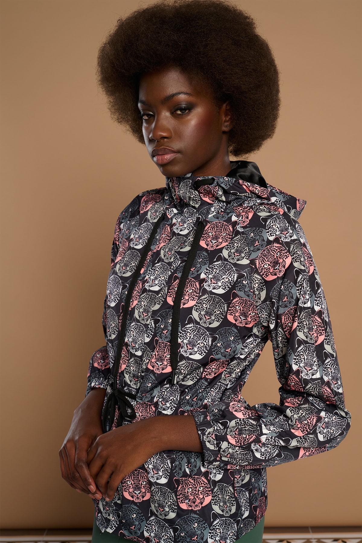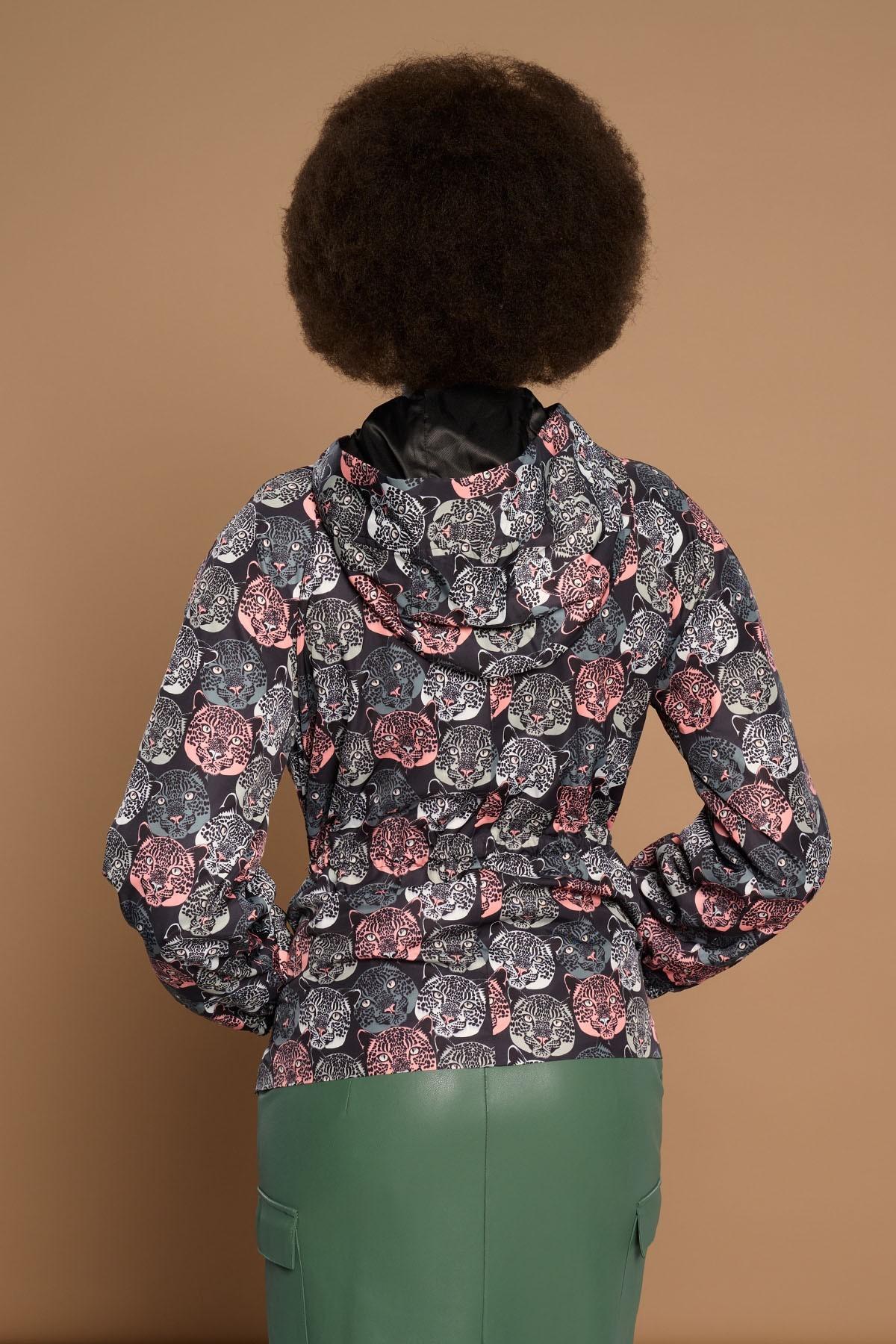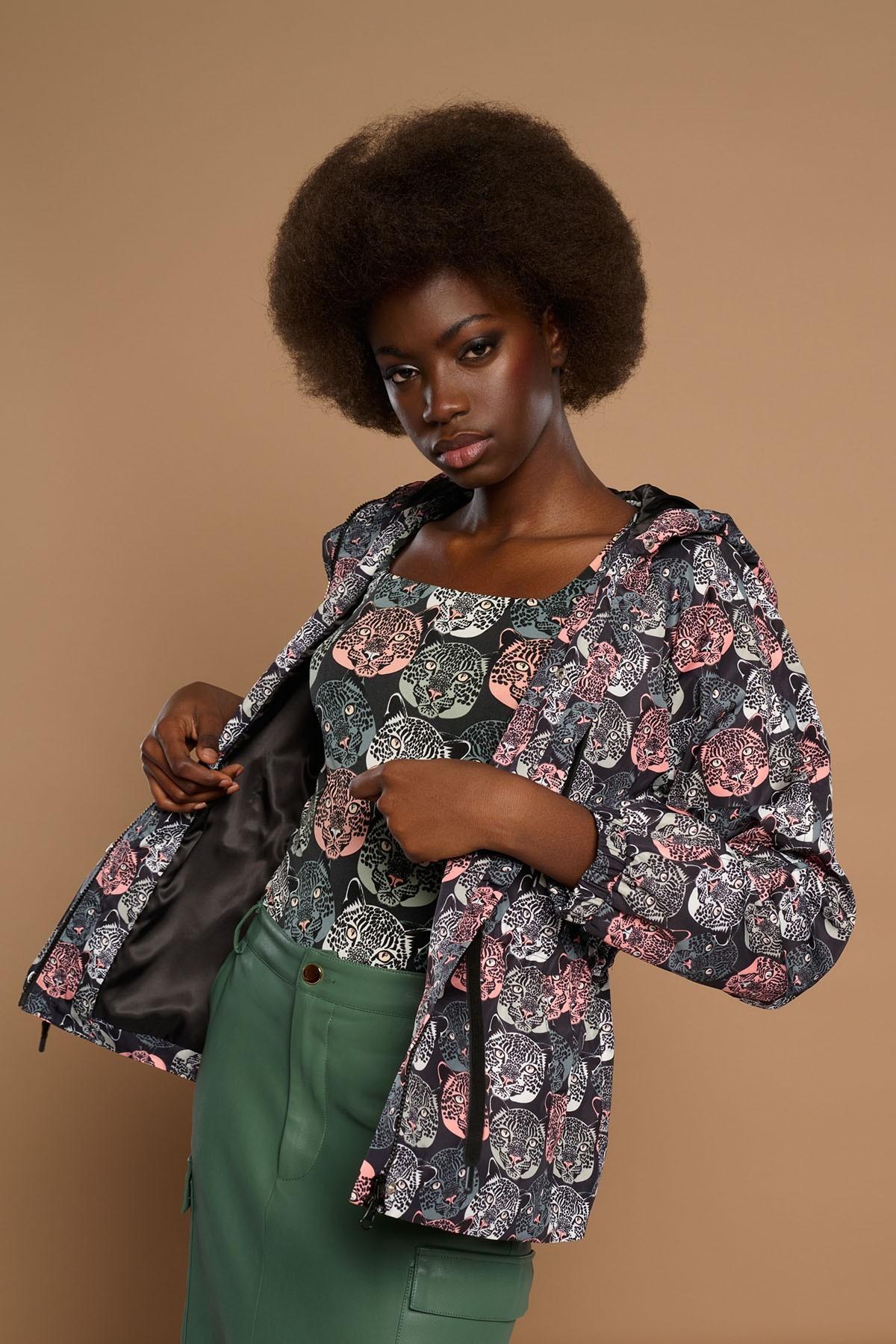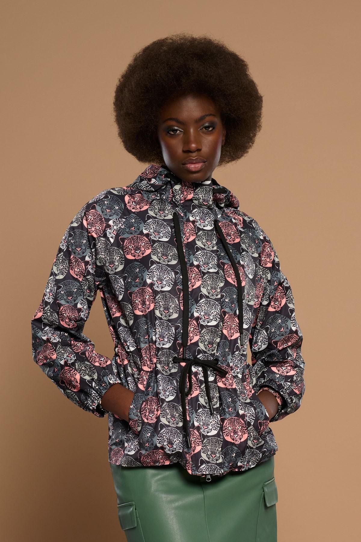 Chaqueta impermeable con forro interior y capucha ajustable. Cierre con cremallera frontal. Estampado de guepardo.