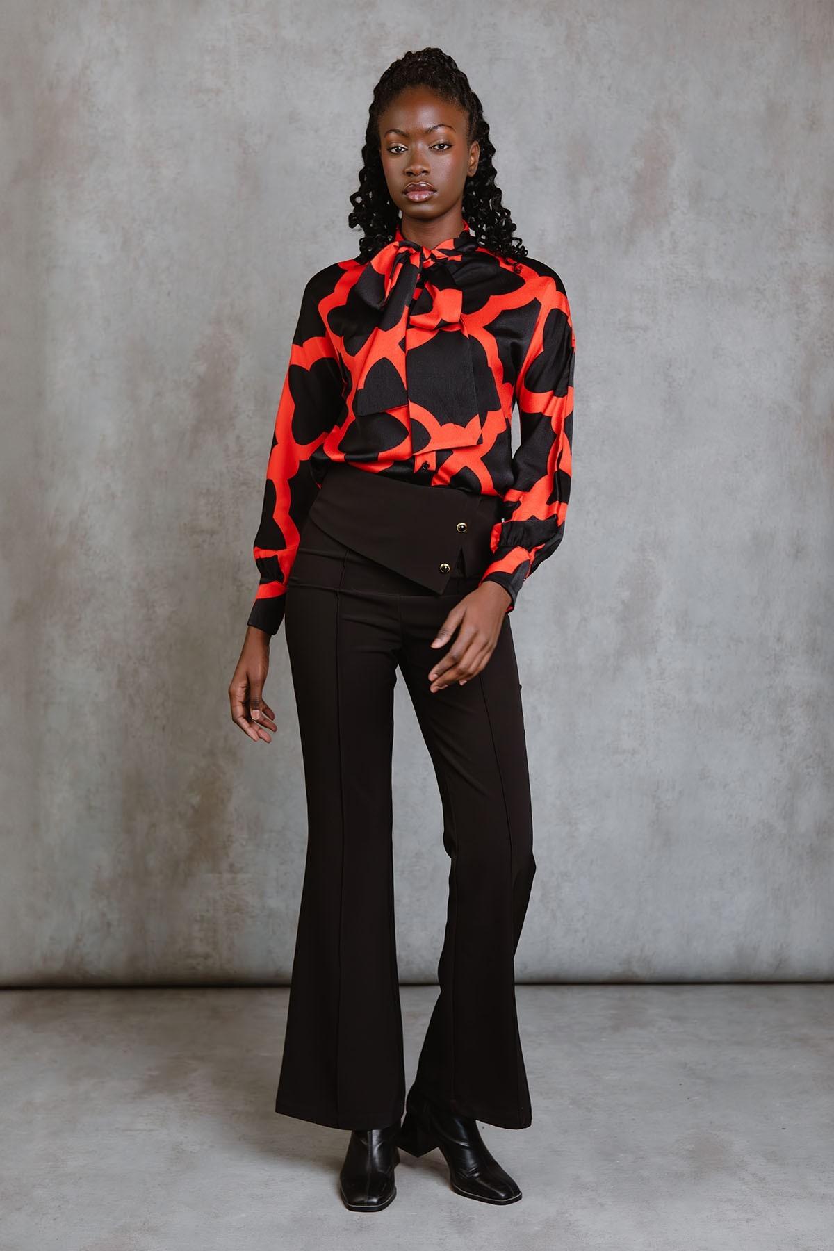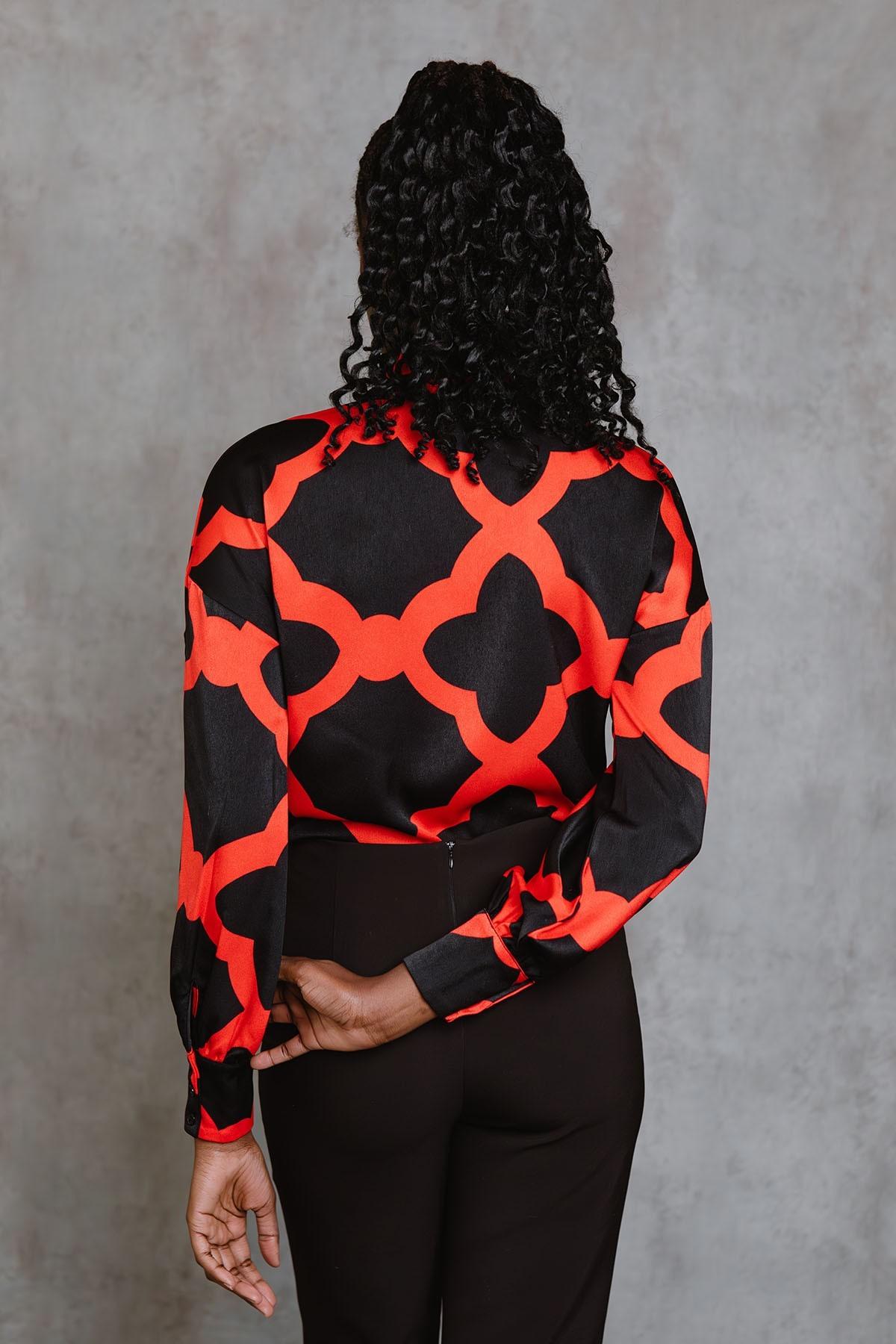 Blusa con lazada al cuello y manga larga con puños ajustados. Cierre con botones en frontal. Estampado mosaico.