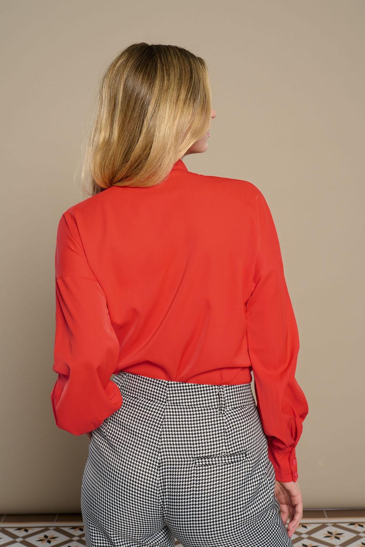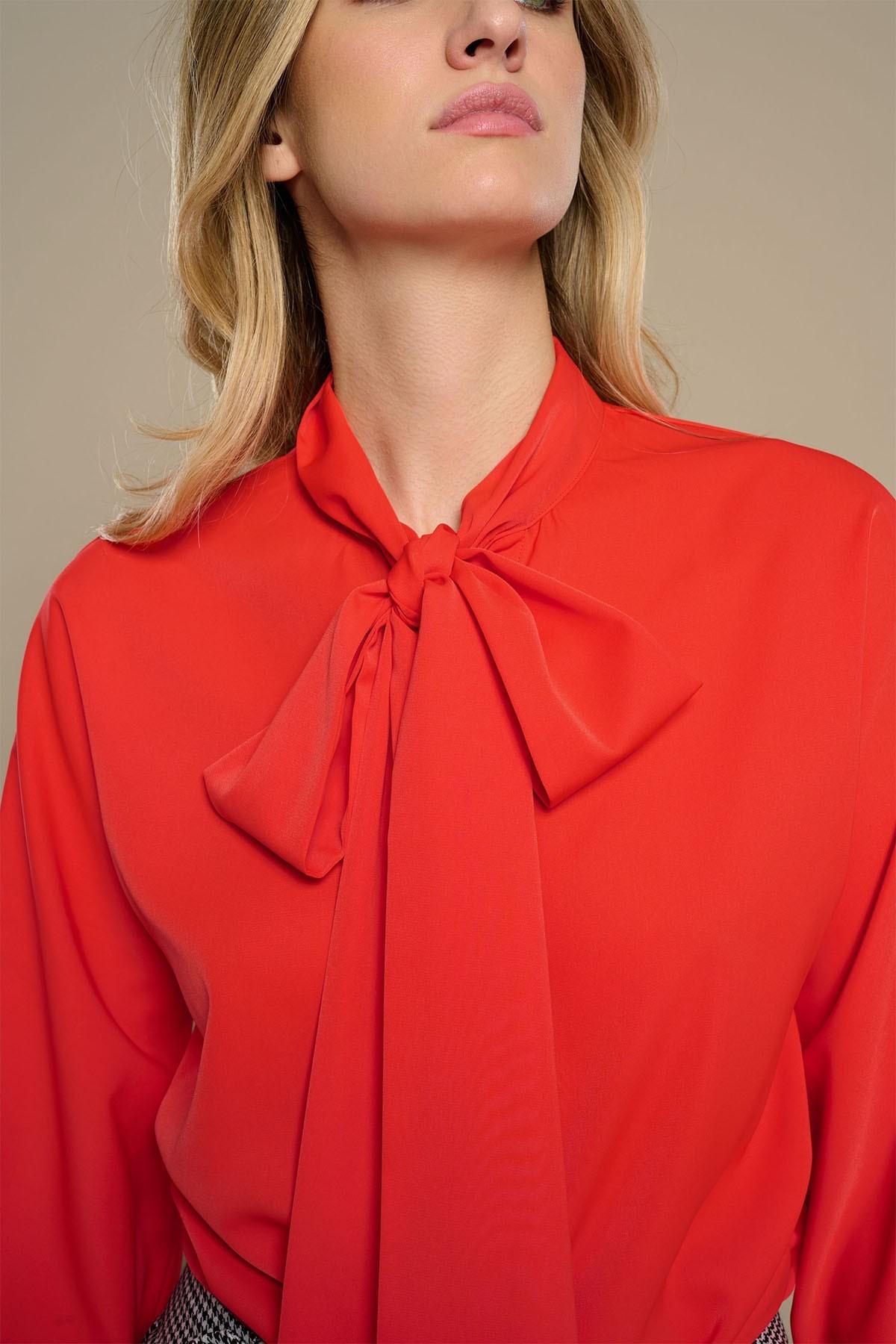 Blusa con lazada al cuello y manga larga ajustada con botones en puño. Tejido fluido.