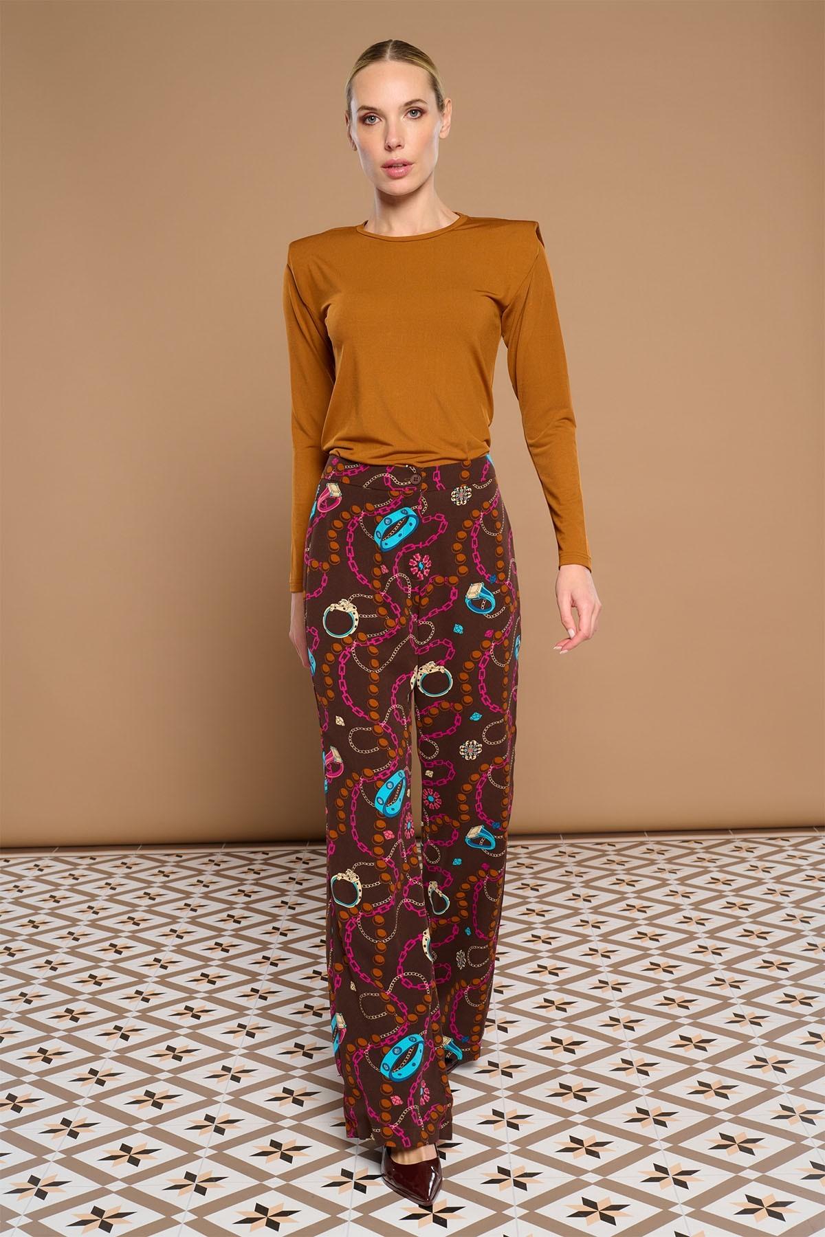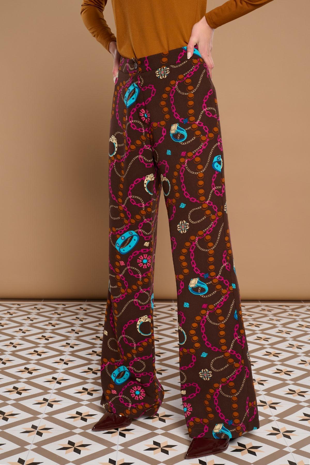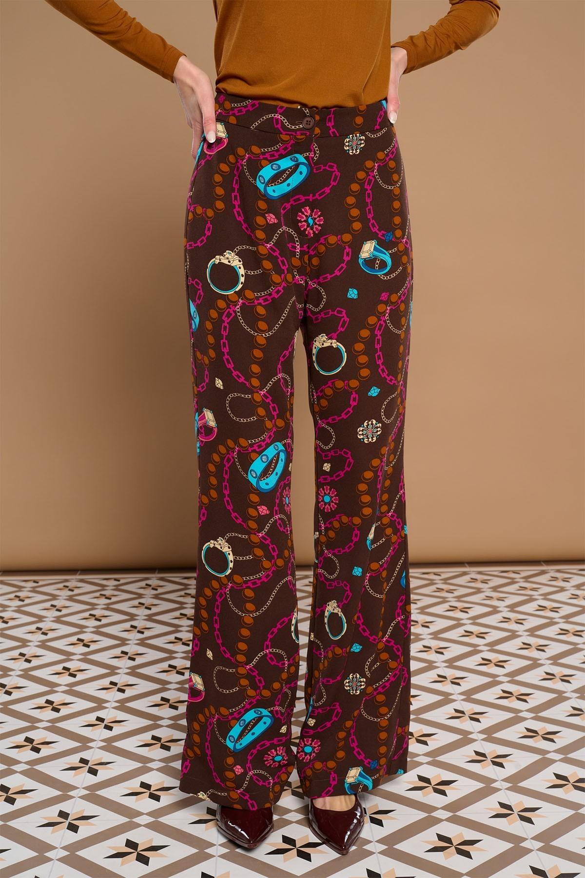 Pantalón de vestir recto y de tiro alto con detalle de pinzas delanteras cerradas y cierre de botón y cremallera. Estampado joya. Forro interior.