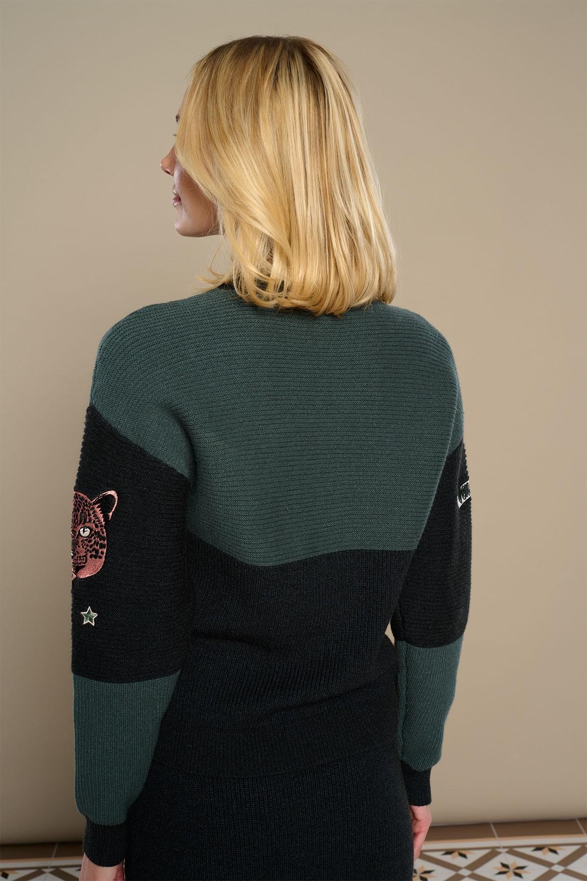 Jersey de punto elástico. Cuello redondo y manga larga. Cuello, puños y cintura en rib. Detalle de tachuelas de estrellas en hombro. Guepardo bordado en manga.