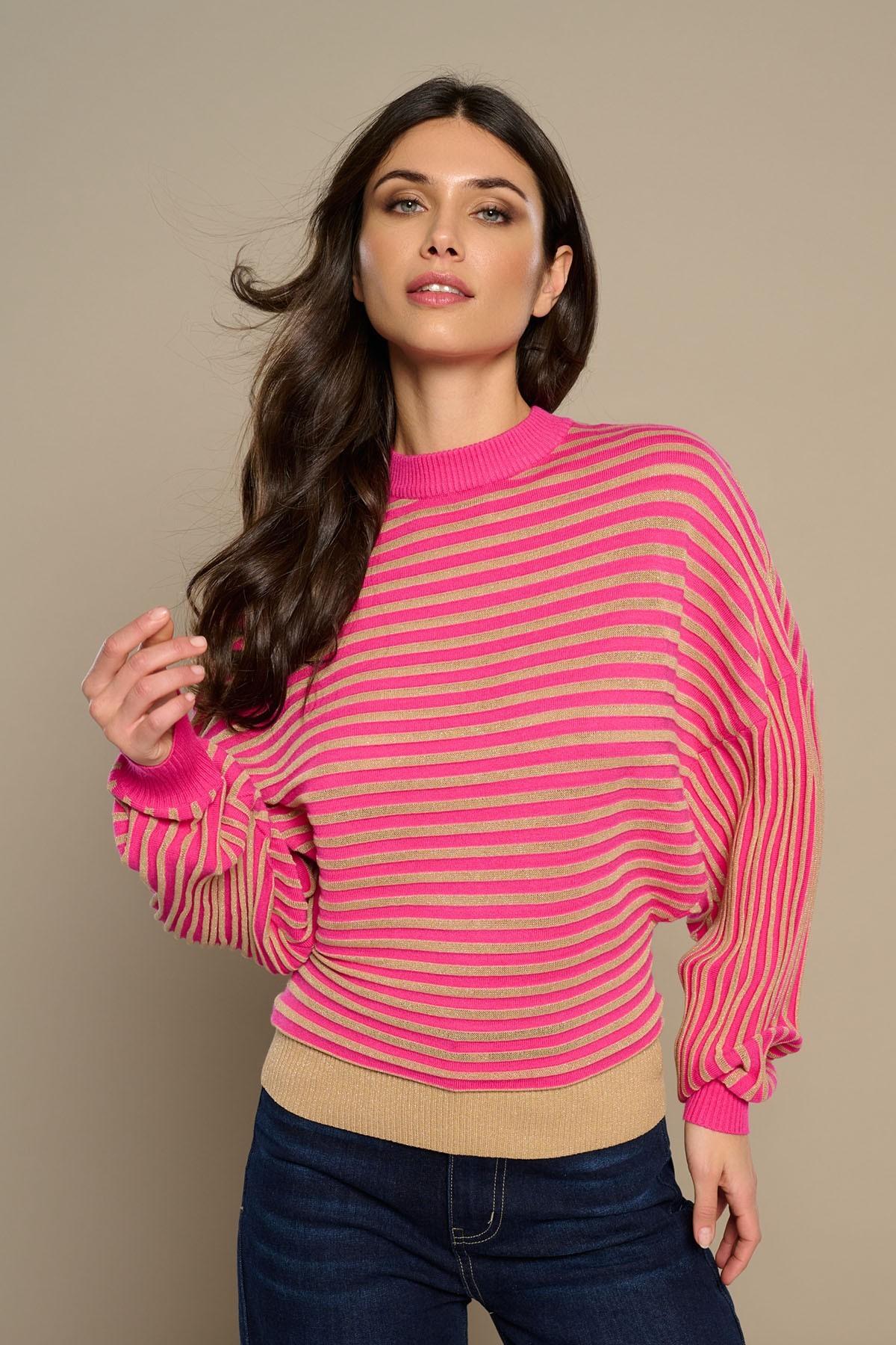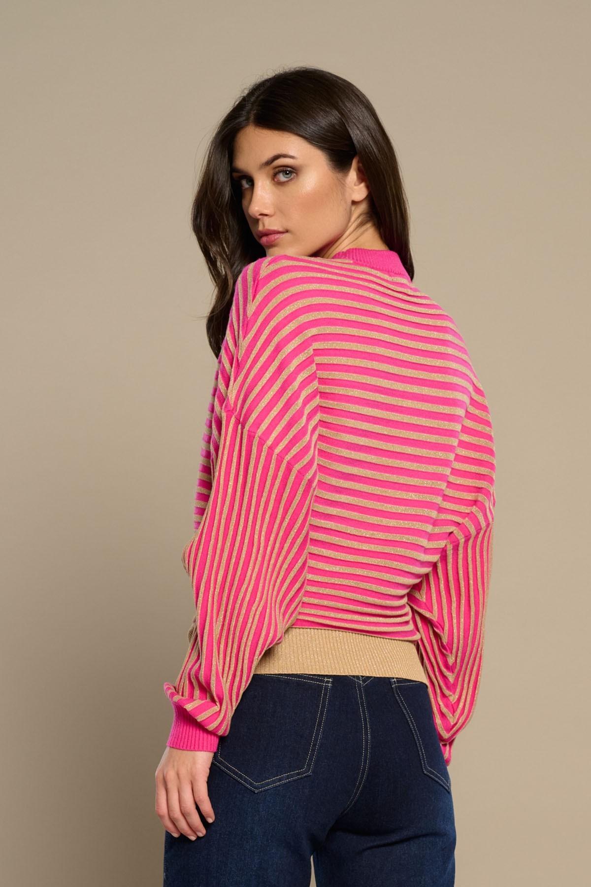 Jersey de punto con cuello redondo y manga larga murciélago. Cuello, puños y cintura en rib. Tejido elástico metalizado.