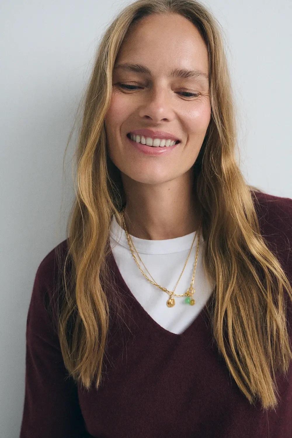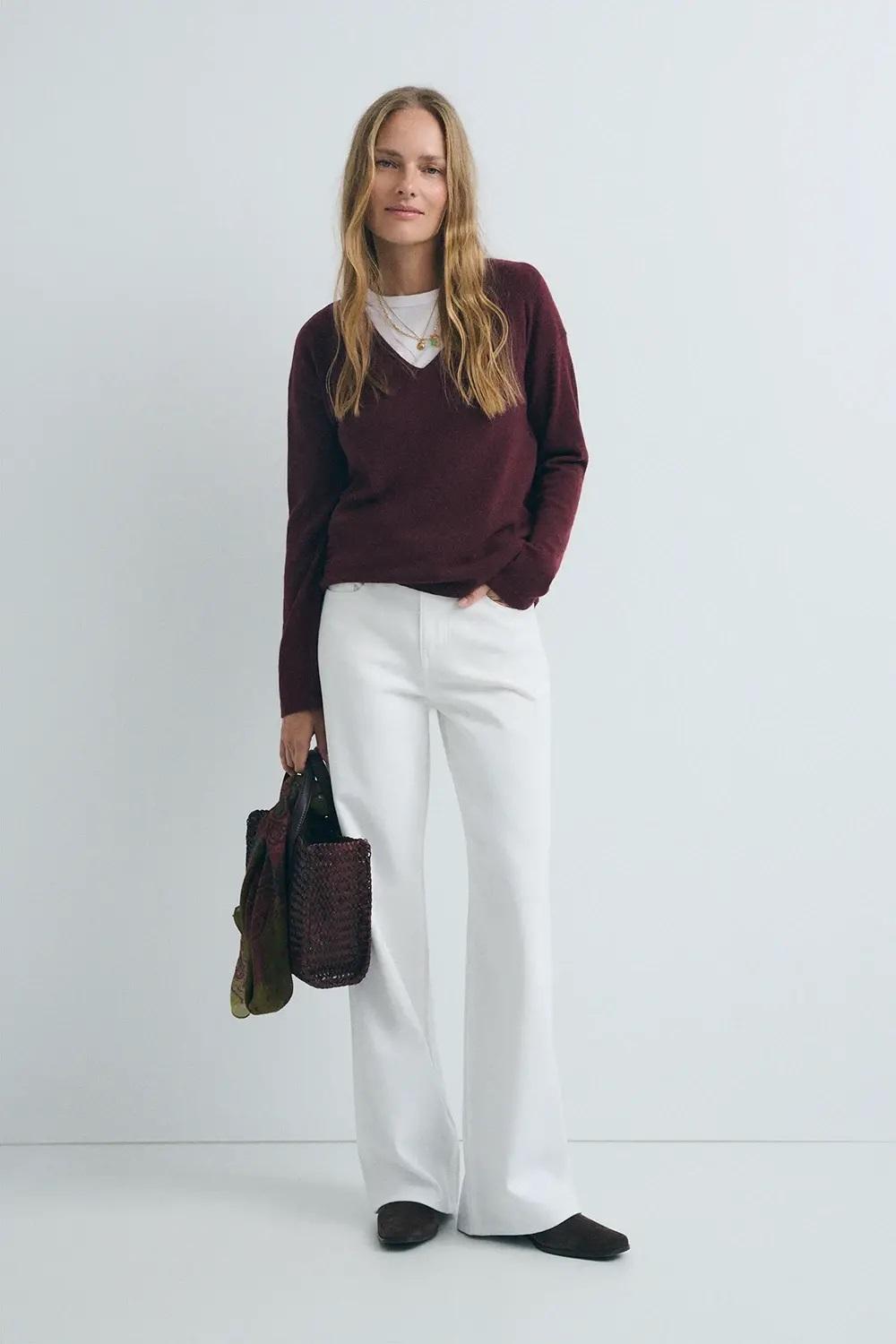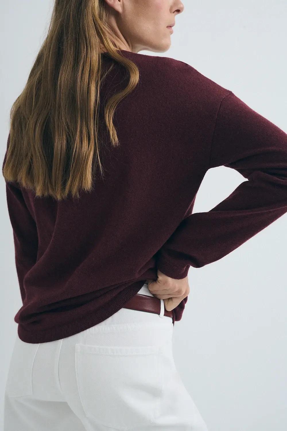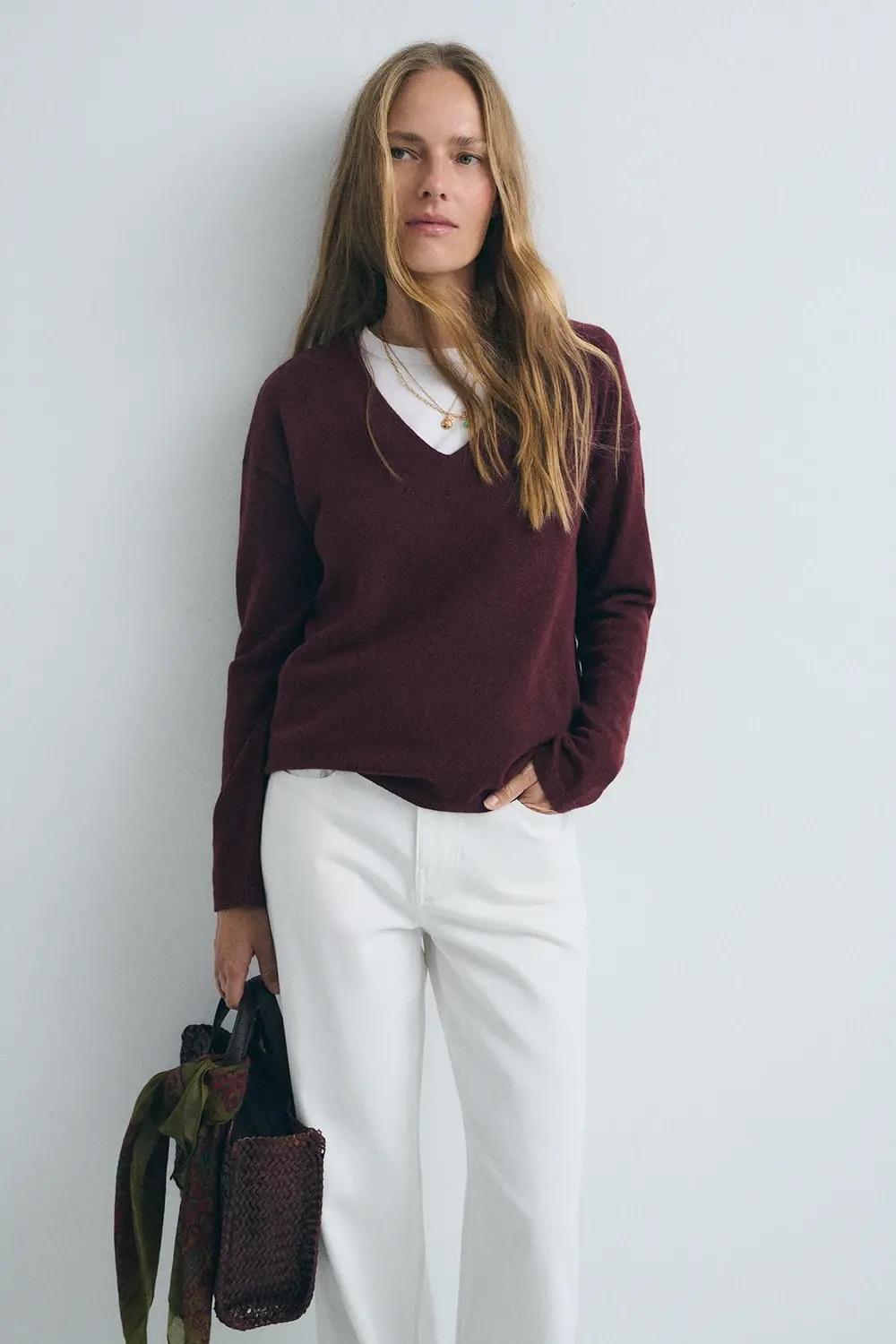 Jersey básico de punto de tejido fino (galga 12). Escote pico. Fitting recto sin ajustar. Tejido de lana cashmere.
