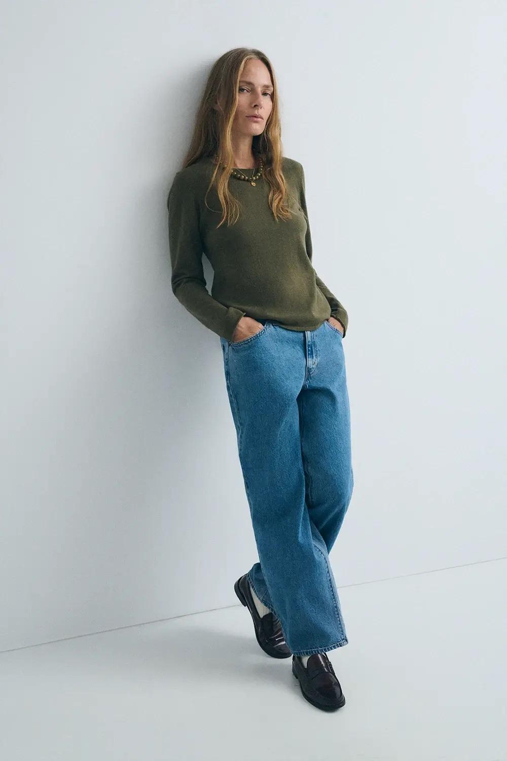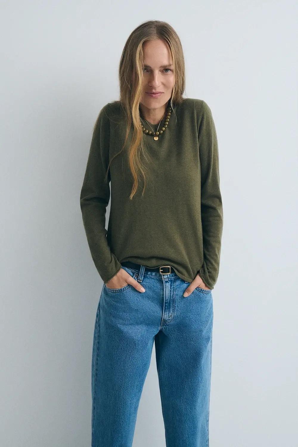 Jersey básico de punto de tejido fino. Color verde. Cuello caja. Manga larga. Fitting recto sin ajustar. Tejido de lana y cashmere semitransparente.