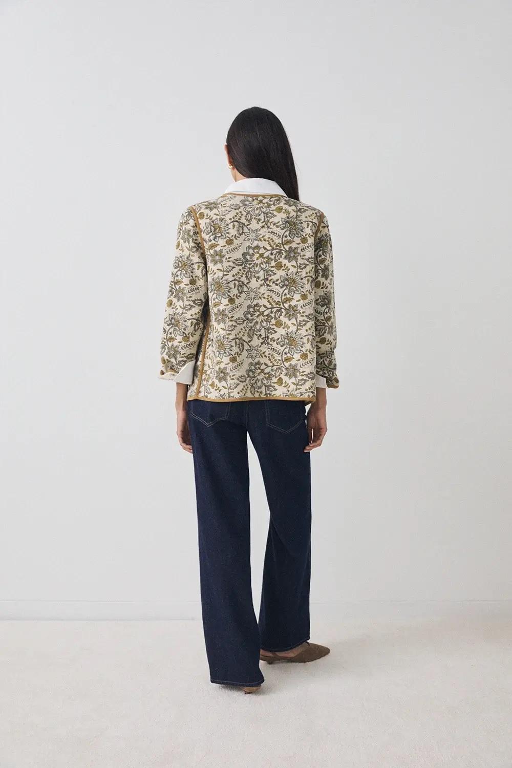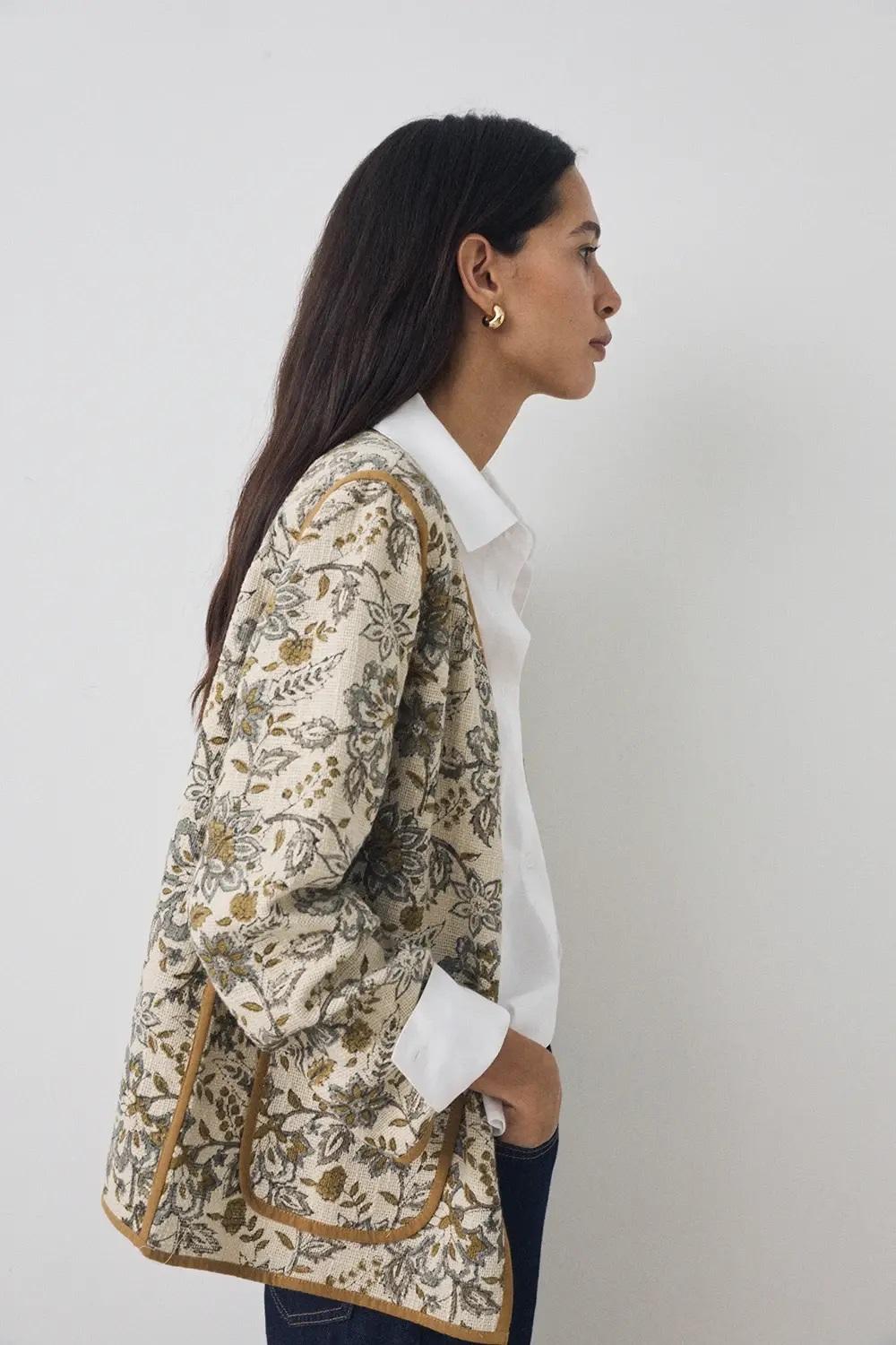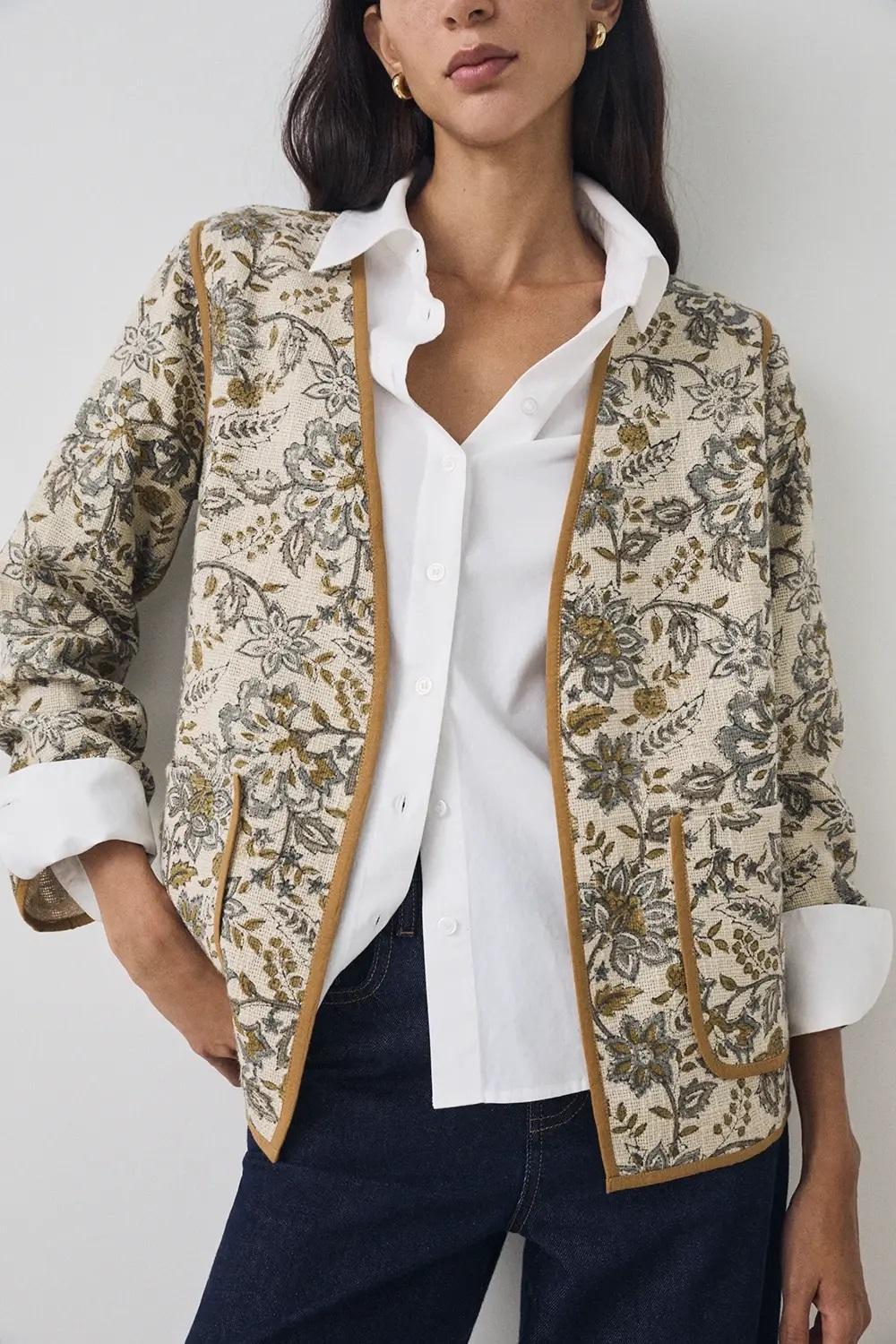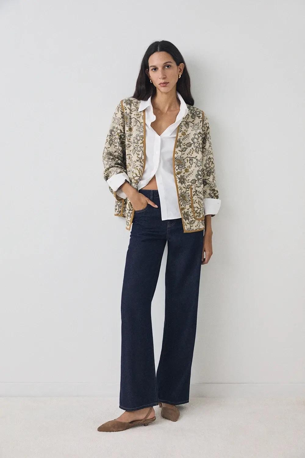 Kimono oversize con estampado de flores en tejido rústico de algodón BCI. Manga amplia. Acabados con ribete marrón. Dos bolsillos delanteros tipo plastrón.