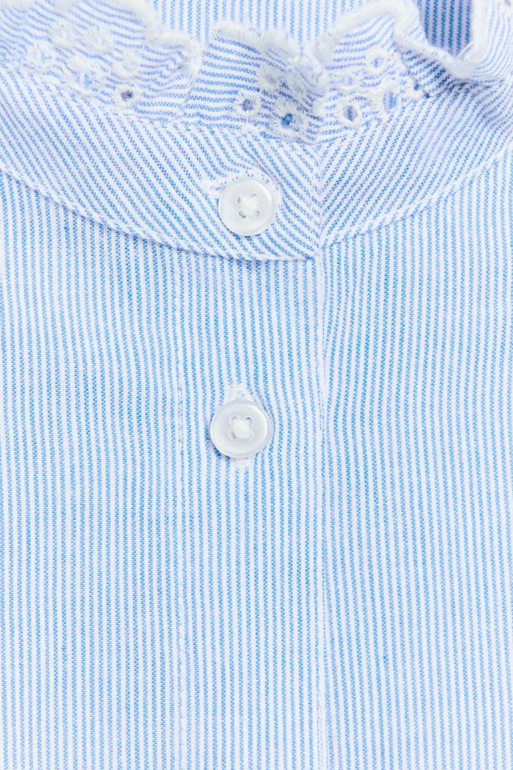 Camisa de 100% algodón BCI. Estampado de rayas. Con cuello mao y bordado inglés en cuello y puño. Tapeta doblada y botones centrales forrados.