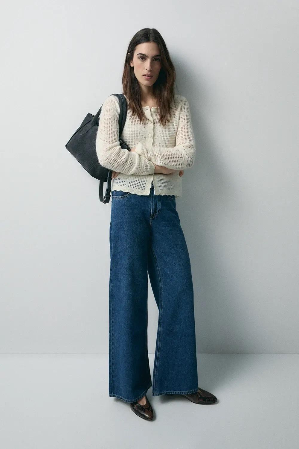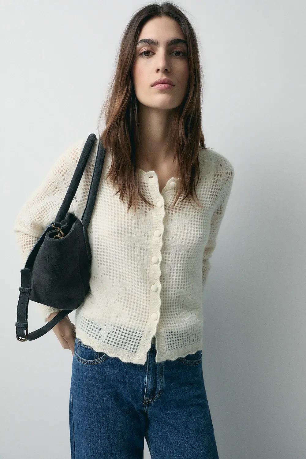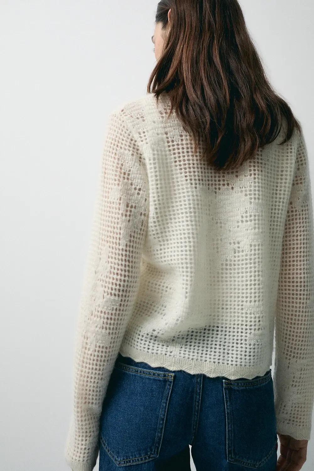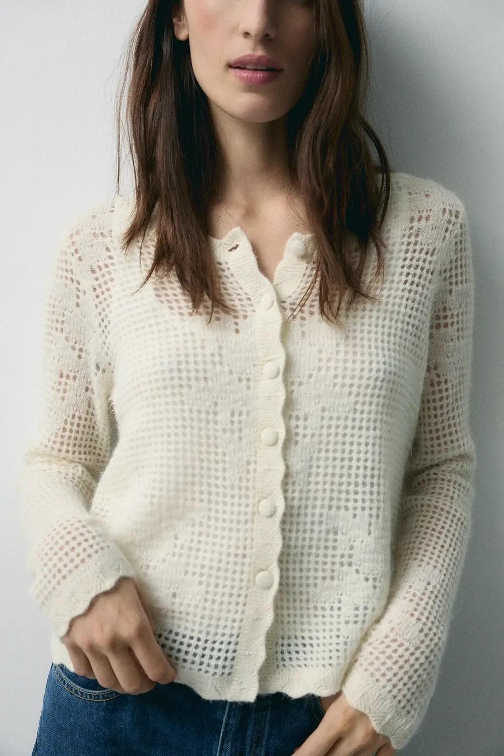 Cárdigan romántico con acabados en volantes. Con mezcla de lana de alpaca. Estructura calada. Cierre con abotonadura central.