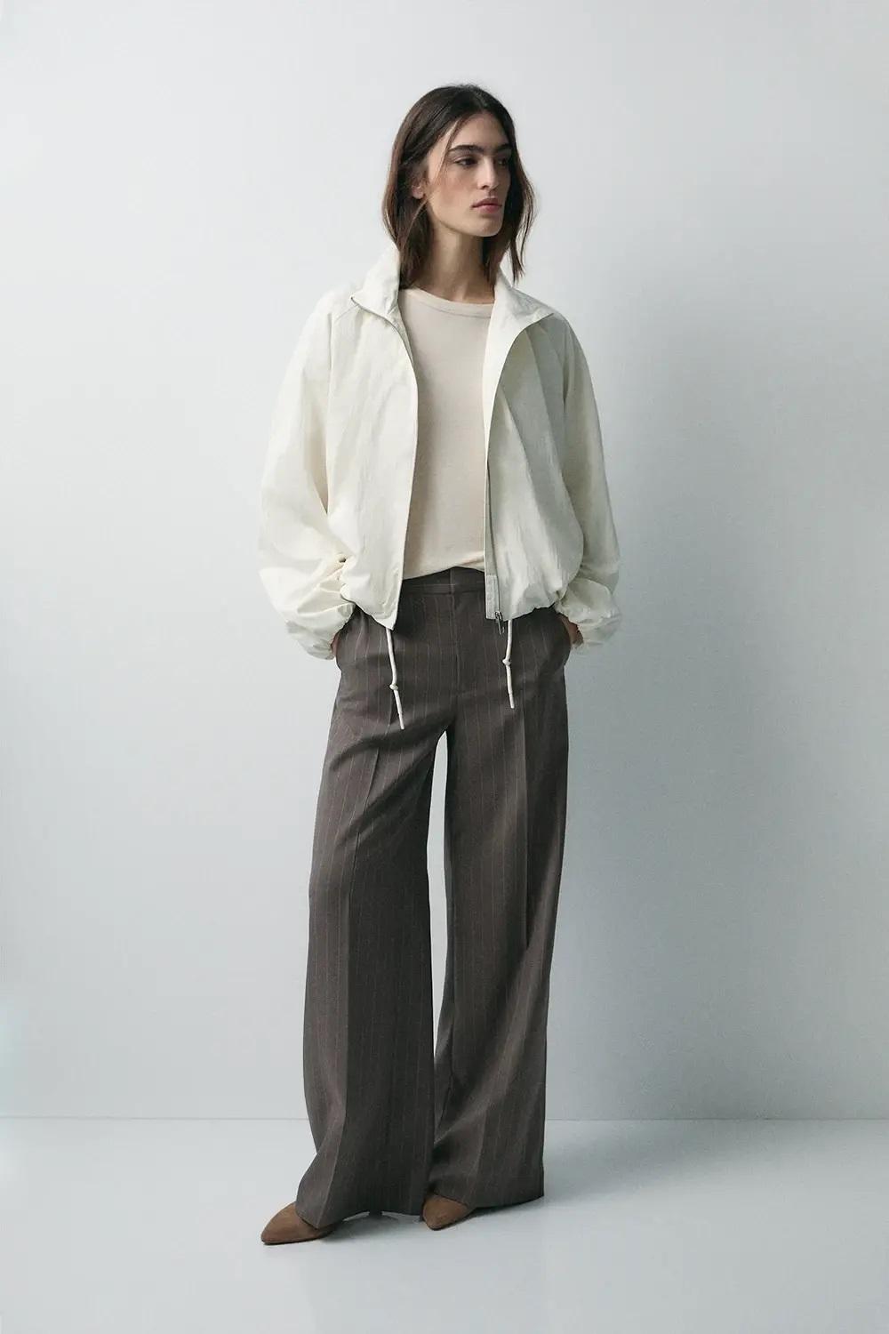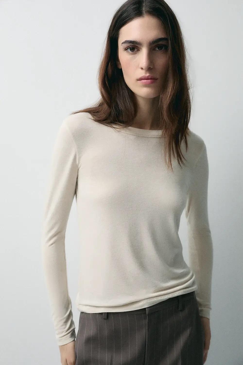 Camiseta básica avena de manga larga. Cuello redondo. Tejido de calidad en viscosa y lana. Ligeramente transparente.