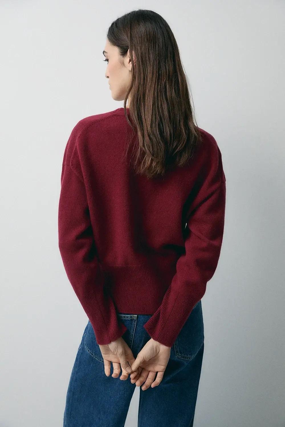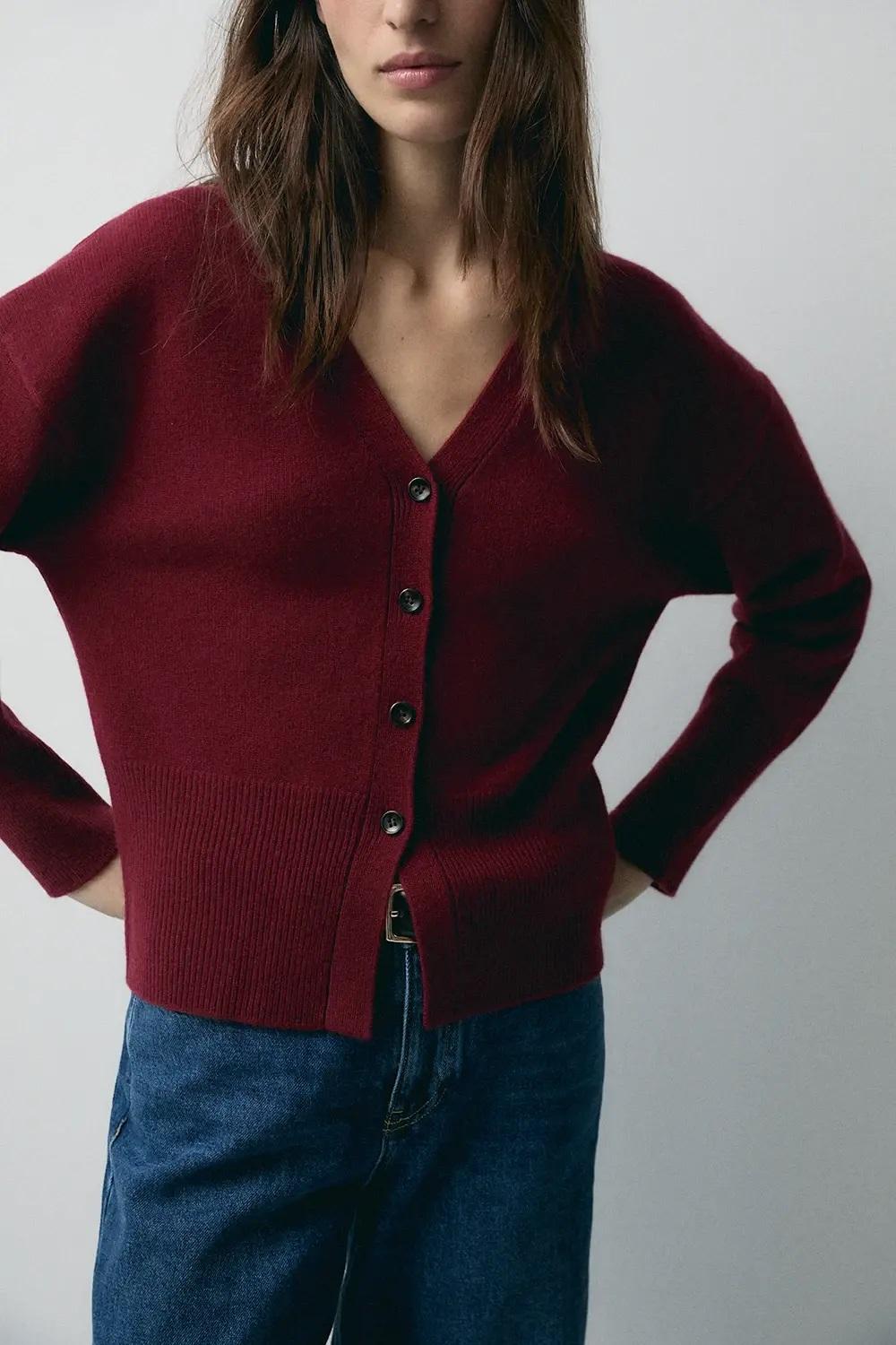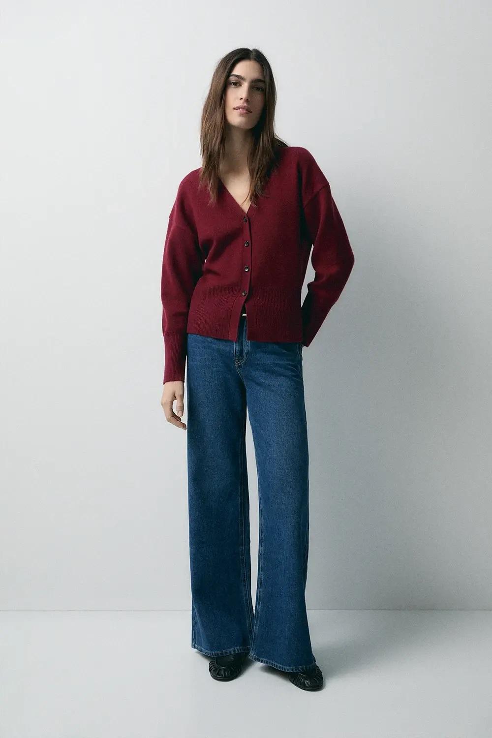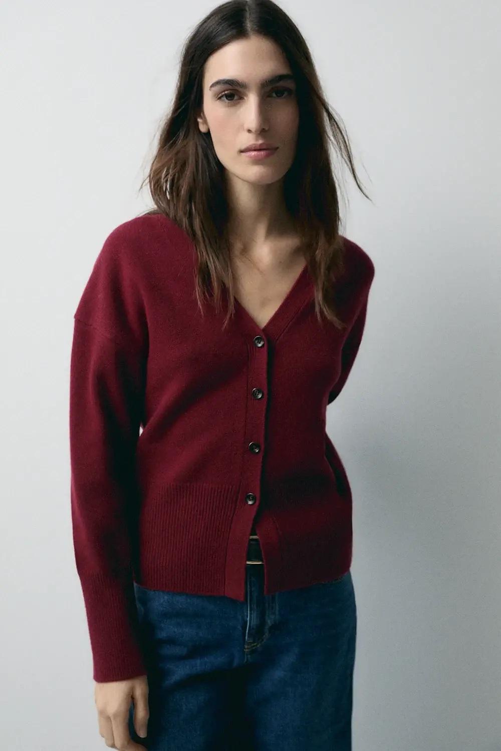 Cárdigan de lana con escote pico. Abotonadura central con 4 botones. Volumen superior y cintura entallada. Cintura entallada.