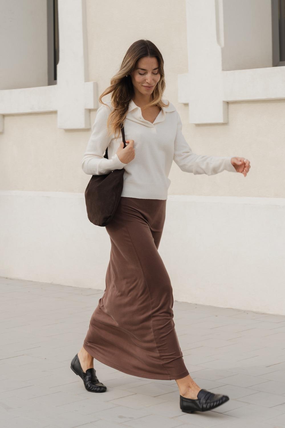 Falda larga fluida. Cinturilla con goma interior. Tejido elástico. Sin cierre. Calidad del tejido tipo cupro.