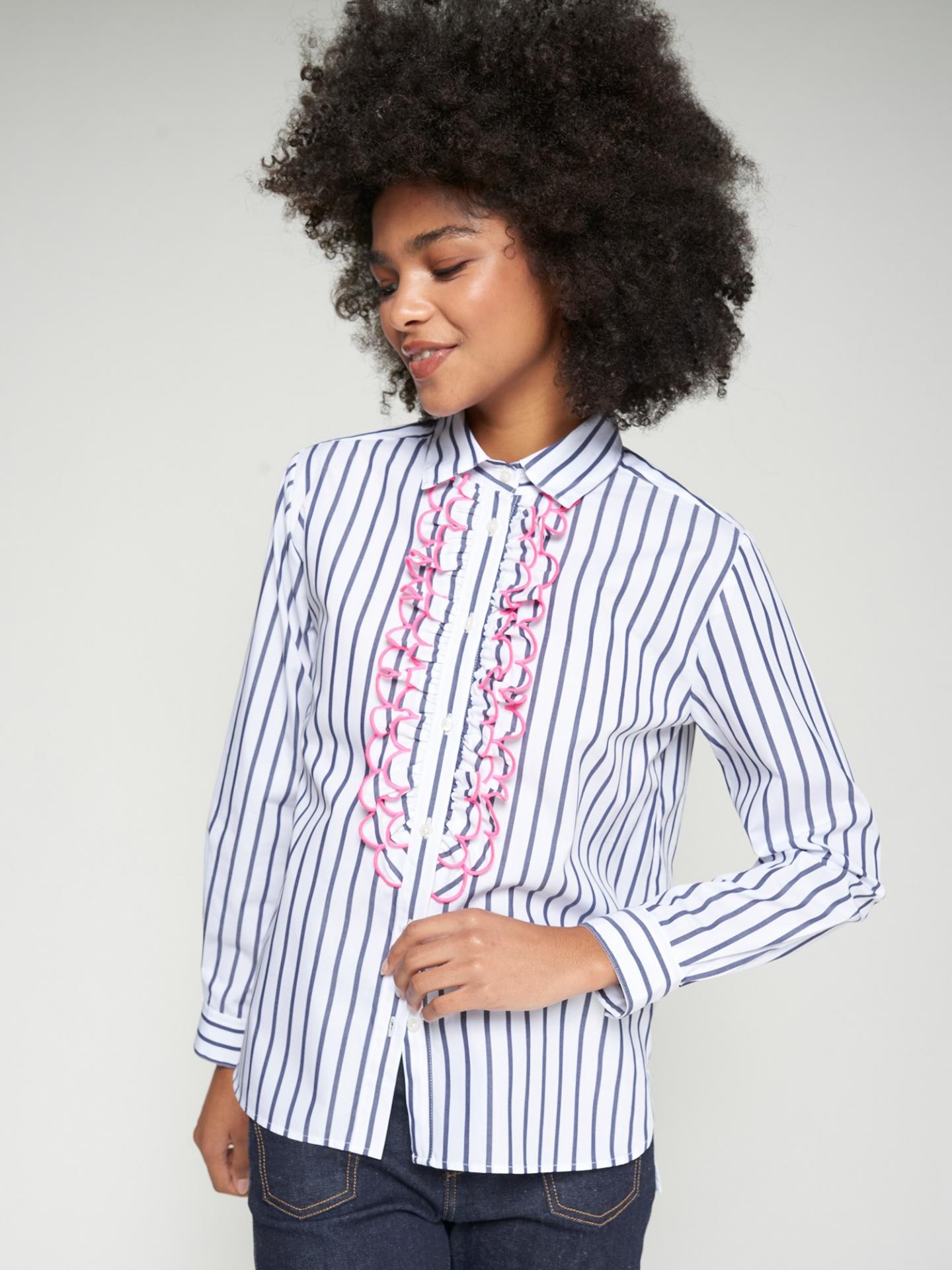 Camisa de rayas azul marino y blanca de popelina 100% algodón. Cuello clásico y cierre frontal con botones visibles. Volantes verticales en el centro delantero con bordado rosa en el contorno. Manga larga con puño abotonado. Corte recto.