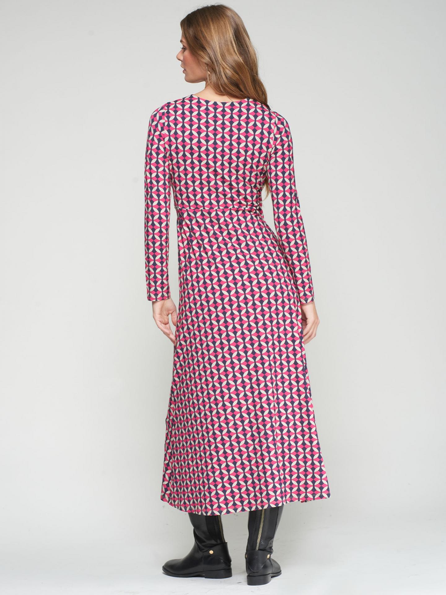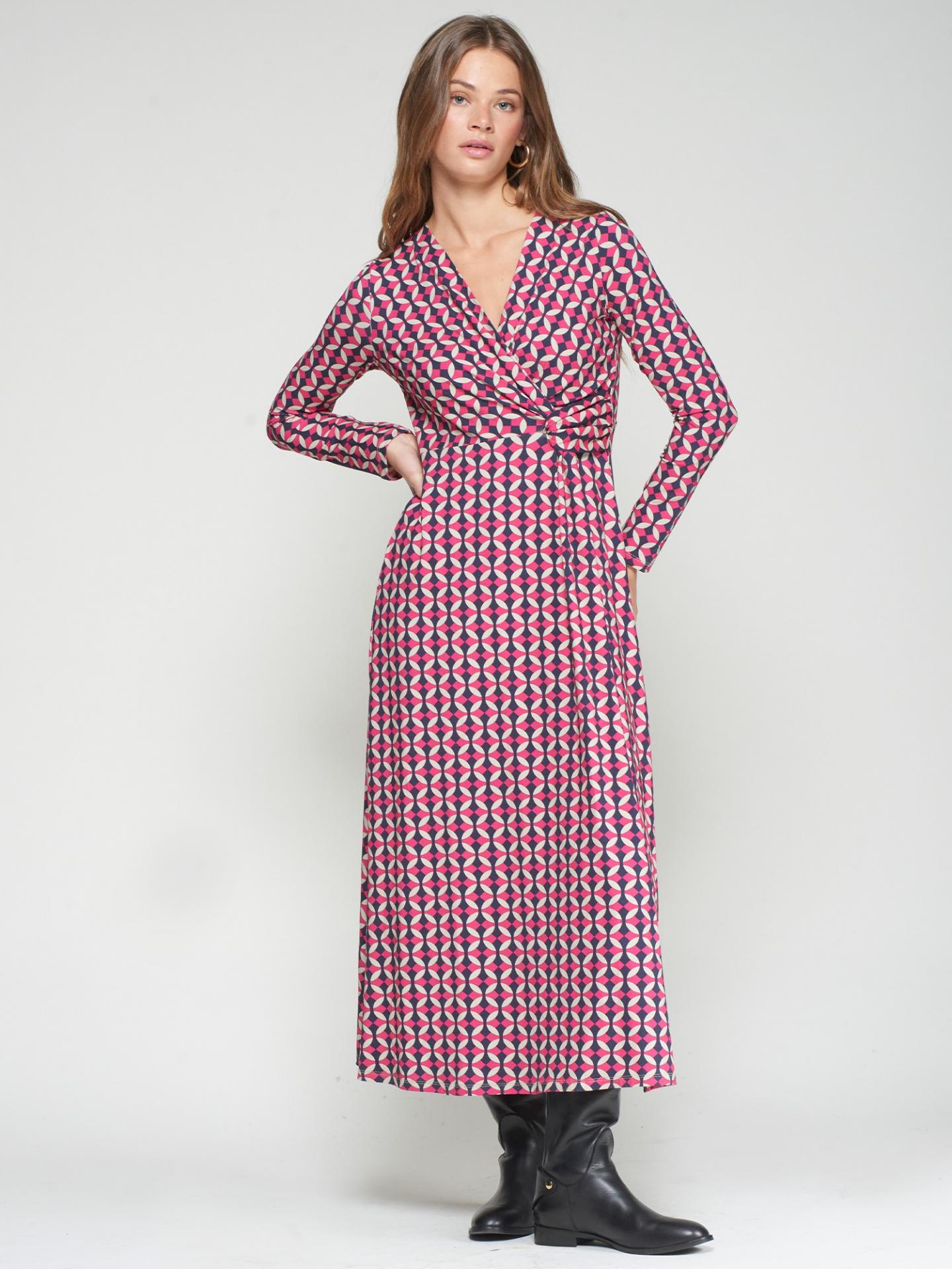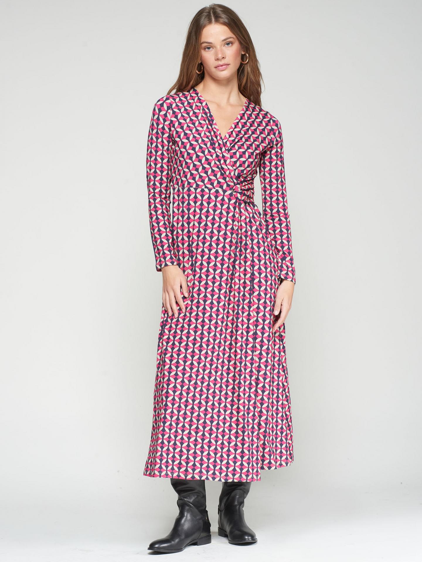 Vestido midi cruzado con escote en pico y frunces laterales. Estampado geométrico fucsia, azul y blanco. Tejido elástico de punto con tacto suave. Corte ajustado en el torso y falda con caída amplia.