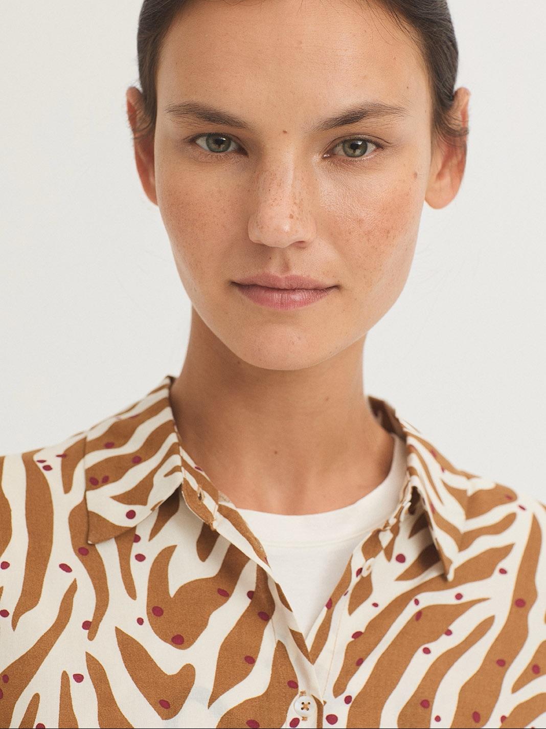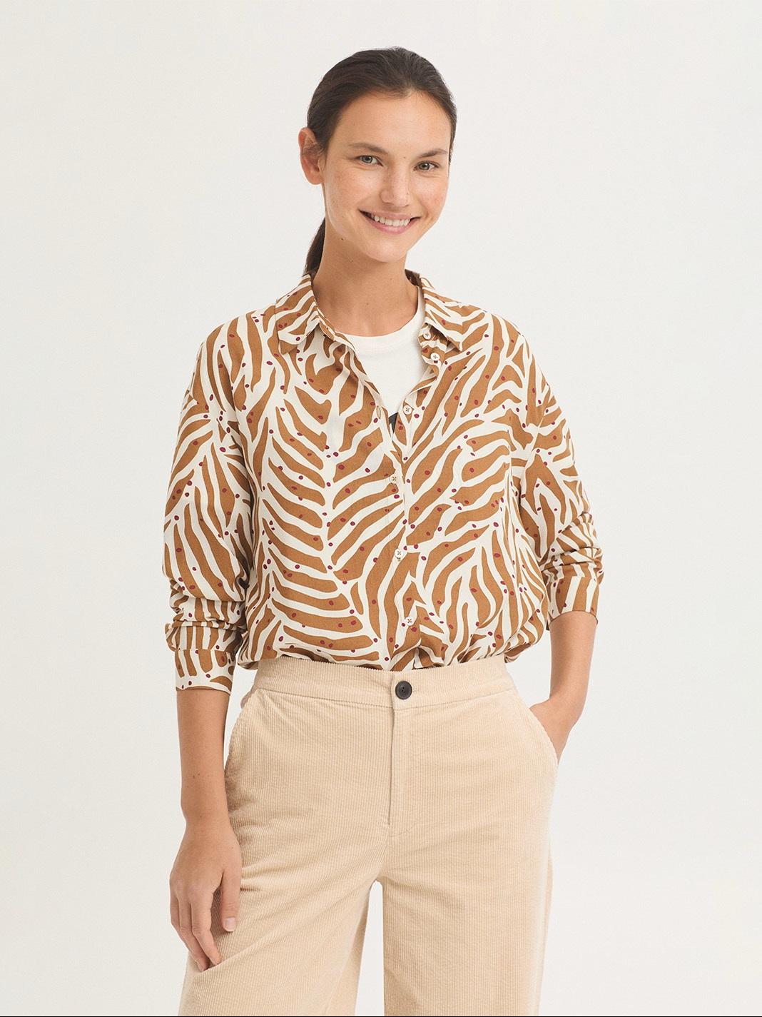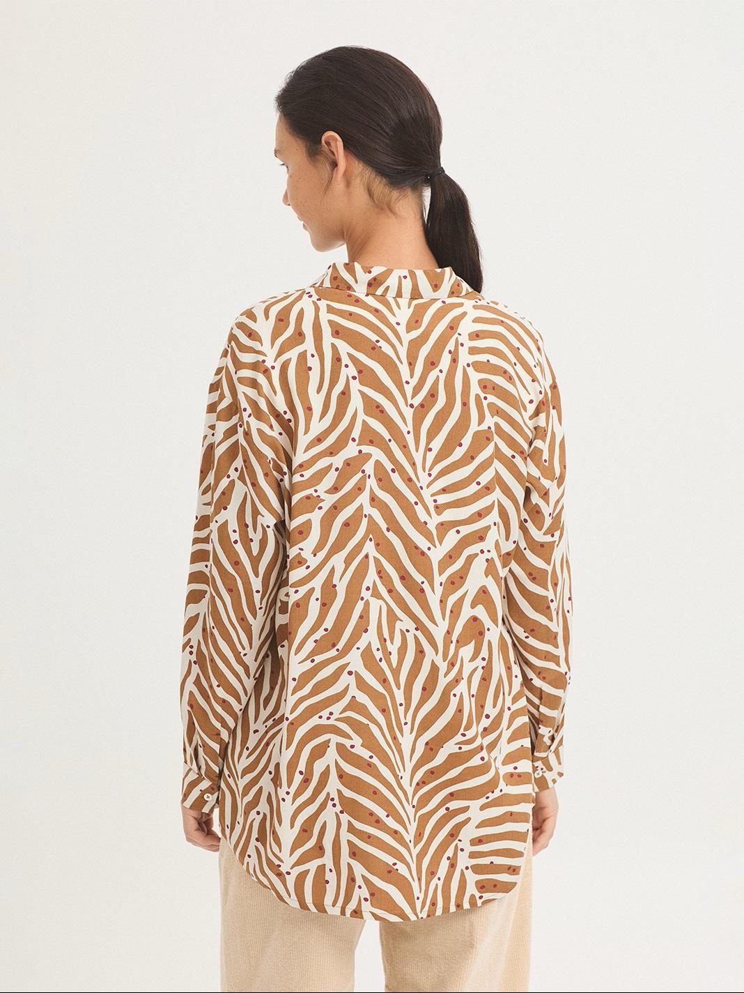 Camisa básica #93 con estampado Zebra, en tejido de viscosa sostenible. Cuello camisero y botonadura de nácar. Manga larga con puño y botón. Corte amplio.