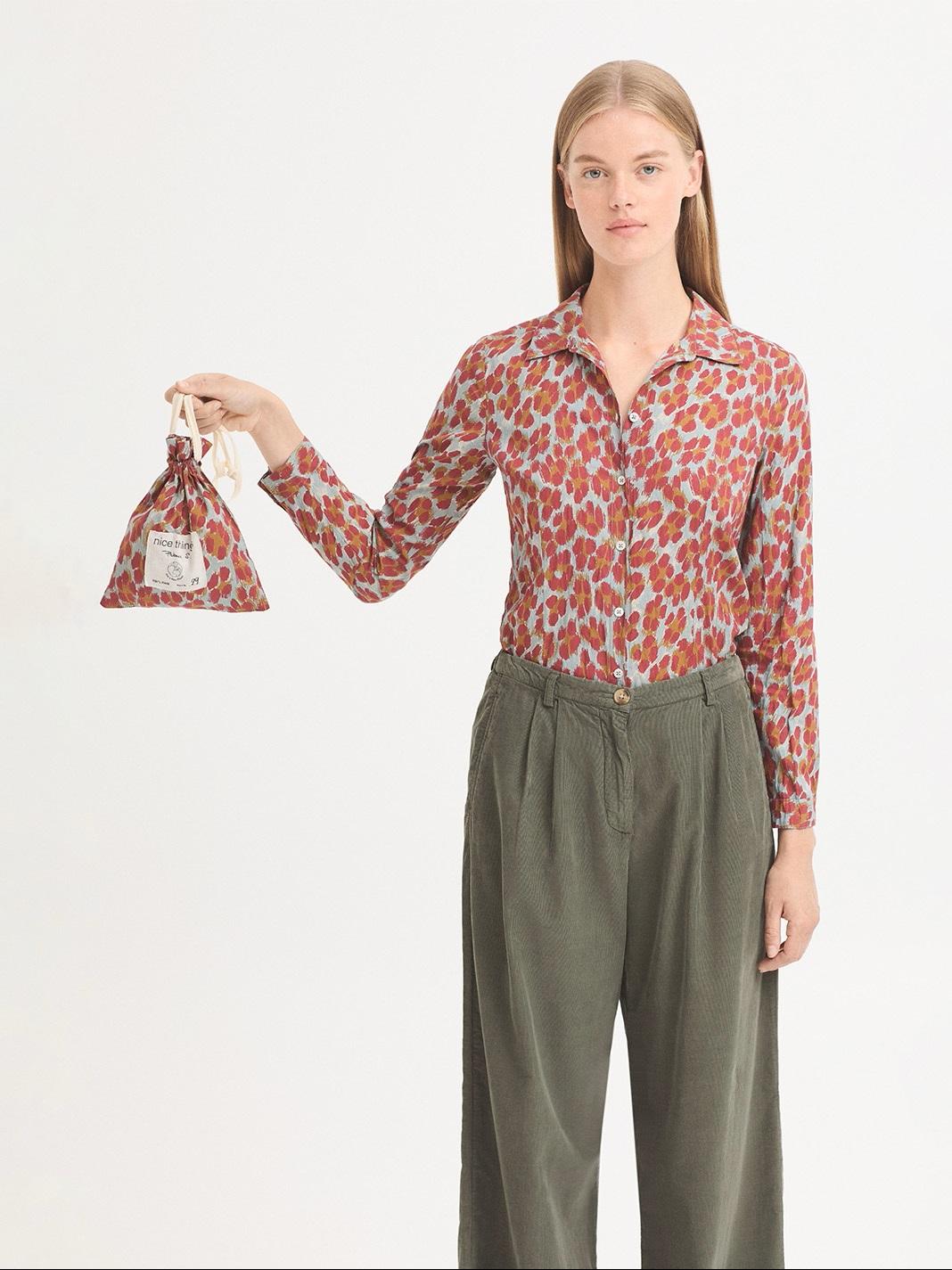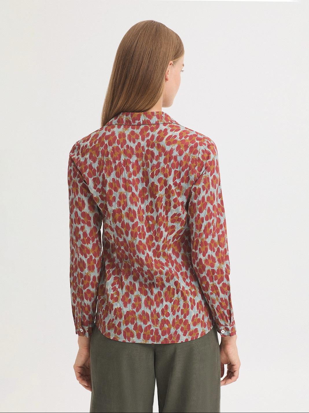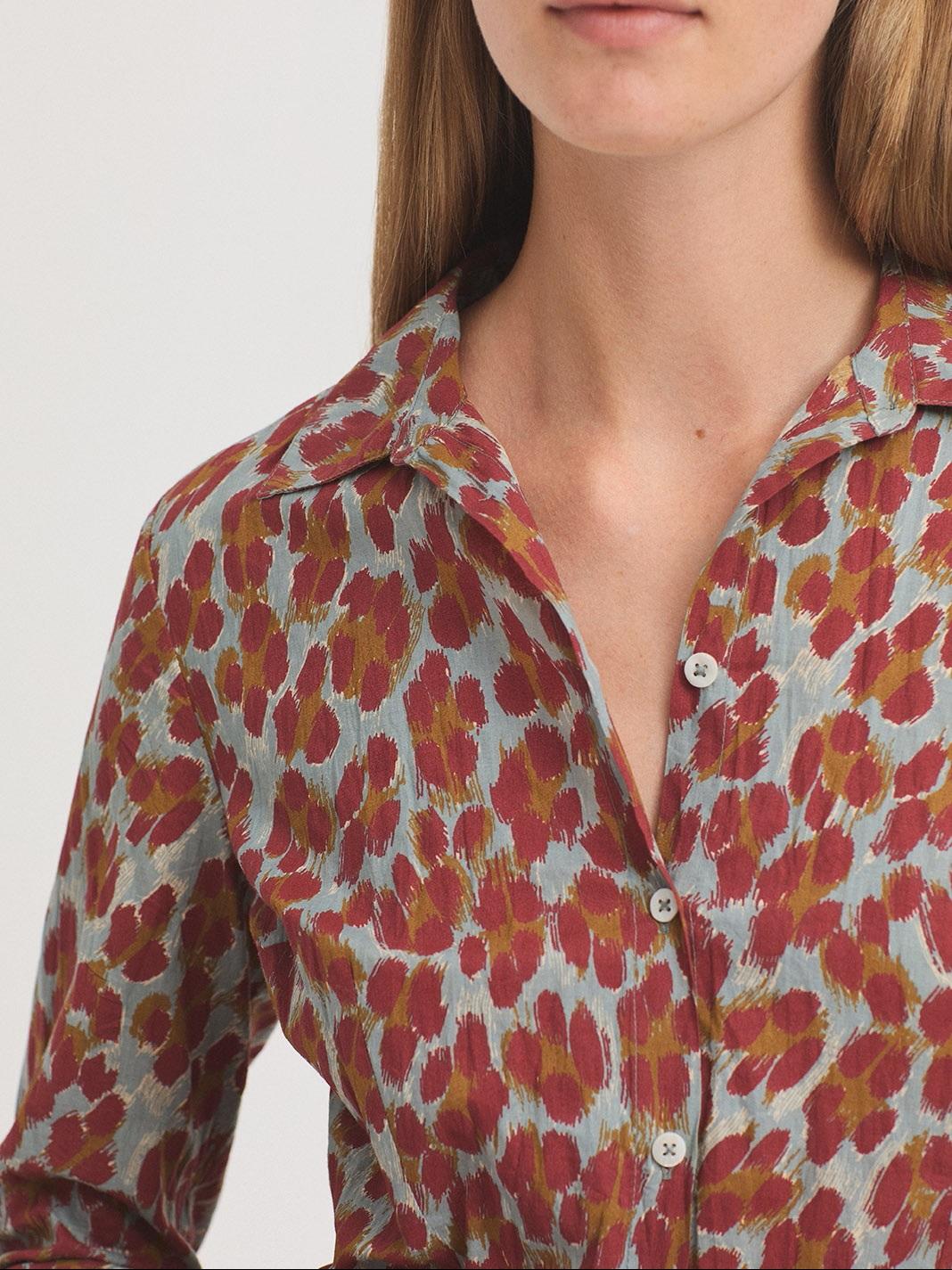Camisa básica #99 con estampado Leopard, en tejido arrugado de algodón sostenible. Cuello camisero y botonadura de nácar. Manga larga con abertura, puño y botón. Presentada en bolsa del mismo tejido.