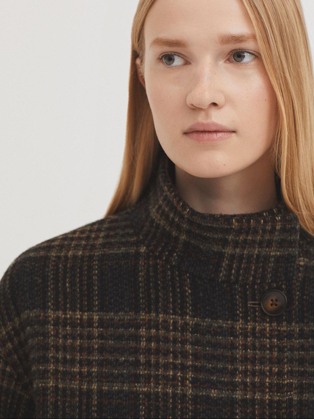 Chaquetón en tejido de cuadros mezcla de lana. Cuello alto y bolsillos con tapetas. Cierre con botones exteriores e interiores. Espalda con canesú, fuelle y tira con botones. Forrado.