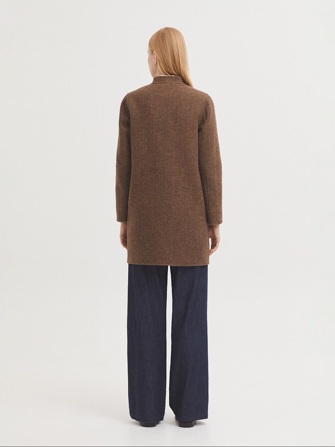 Abrigo en tejido de espiga doble faz, en mezcla de lana. Cuello levantado, doble botonadura y botón interior. Bolsillos con tapetas y bolsillo de vivo en el pecho.