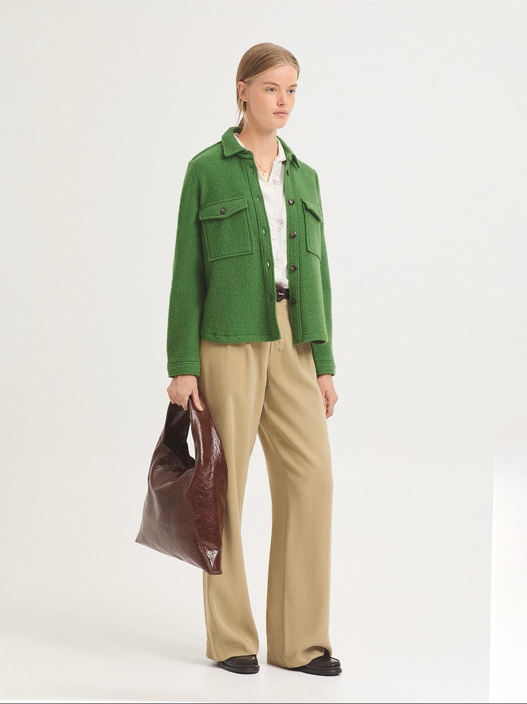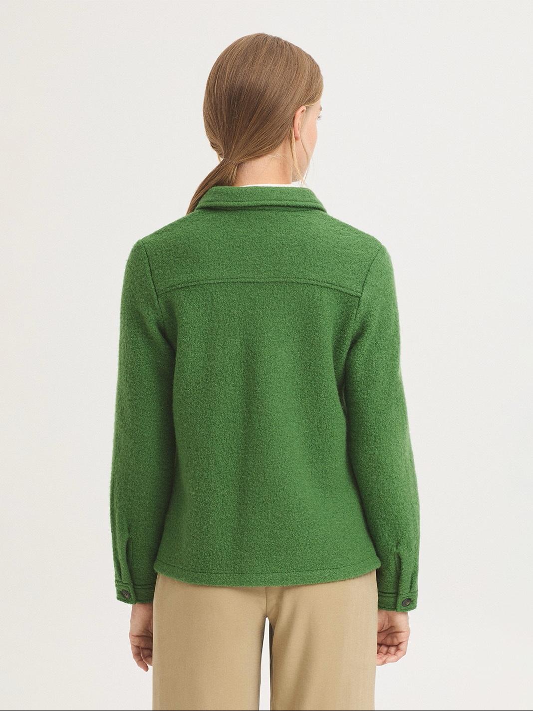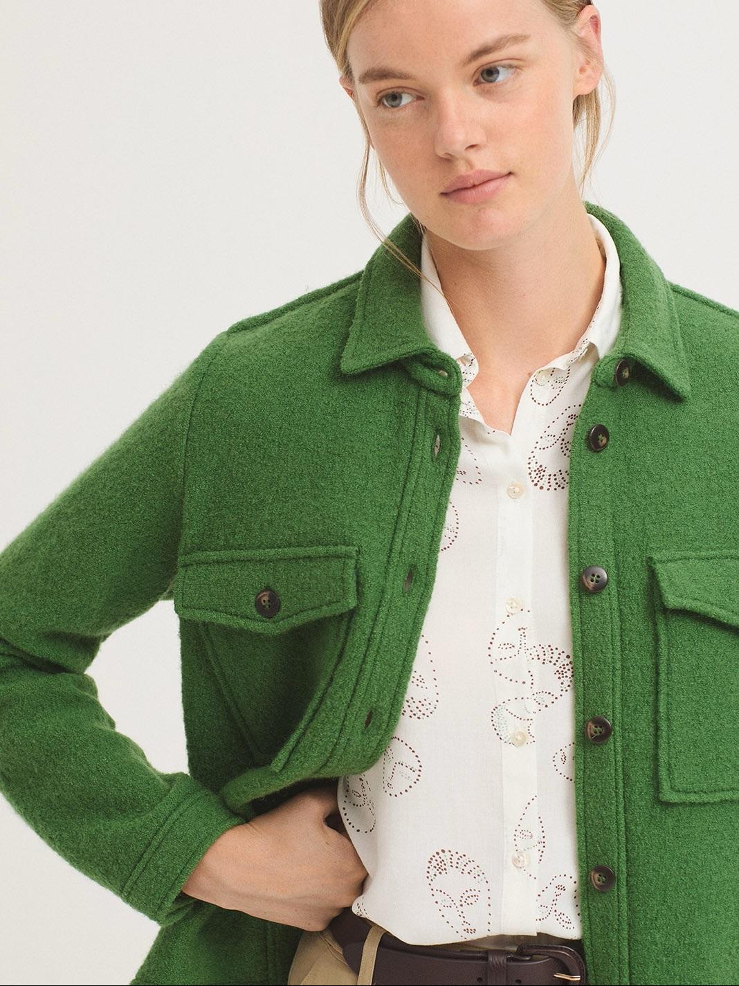 Chaqueta en tejido 100 % lana hervida. Cuello camisero, bolsillos de parche con tapeta y botones. Manga larga con abertura, puño y botón. Canesú en la espalda.