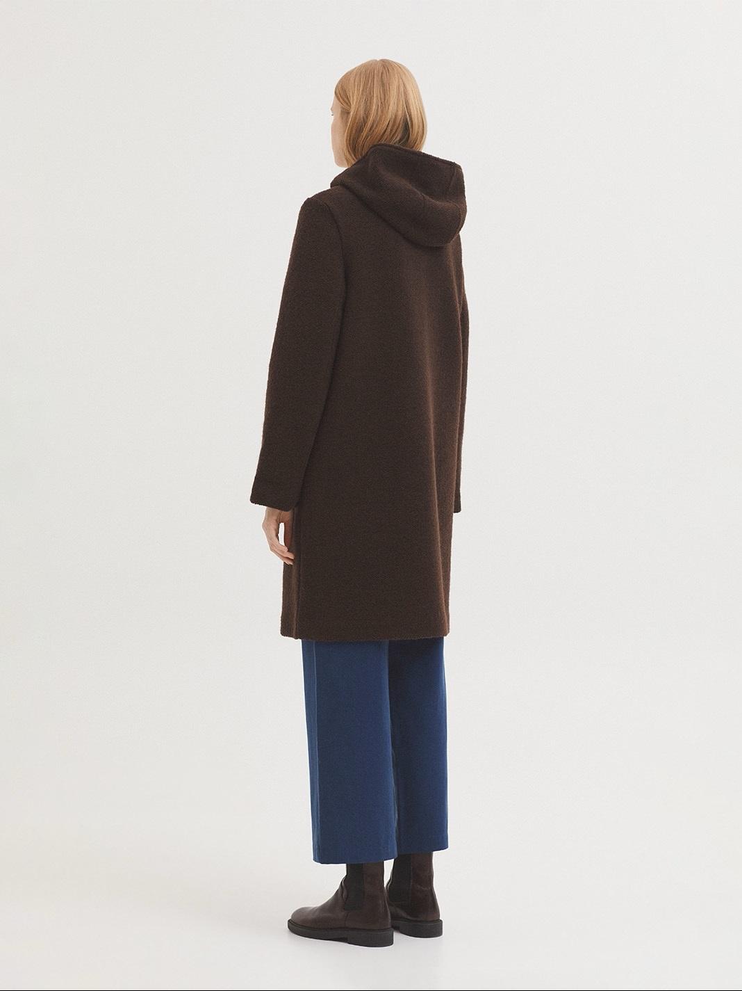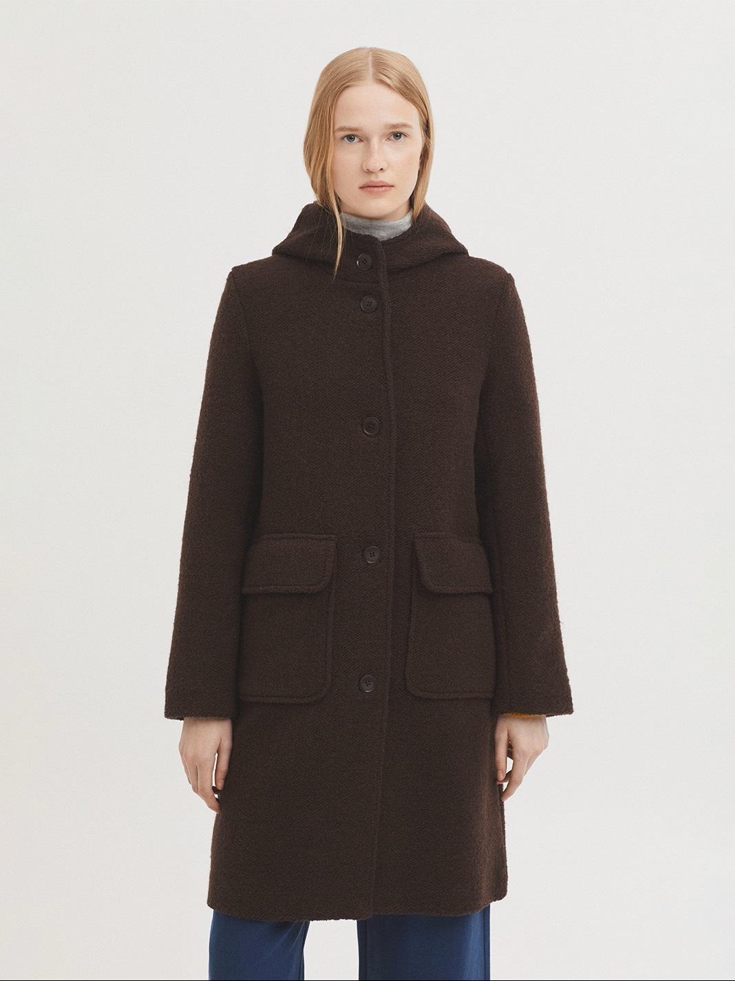 Abrigo en tejido 100 % lana hervida. Capucha, botonadura frontal y bolsillos de parche con tapetas. Forrado.