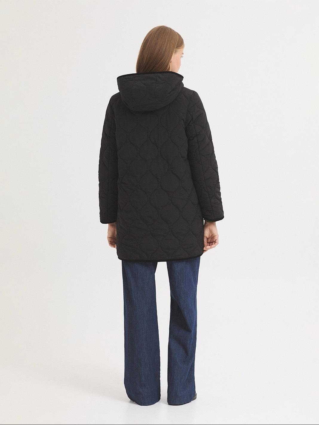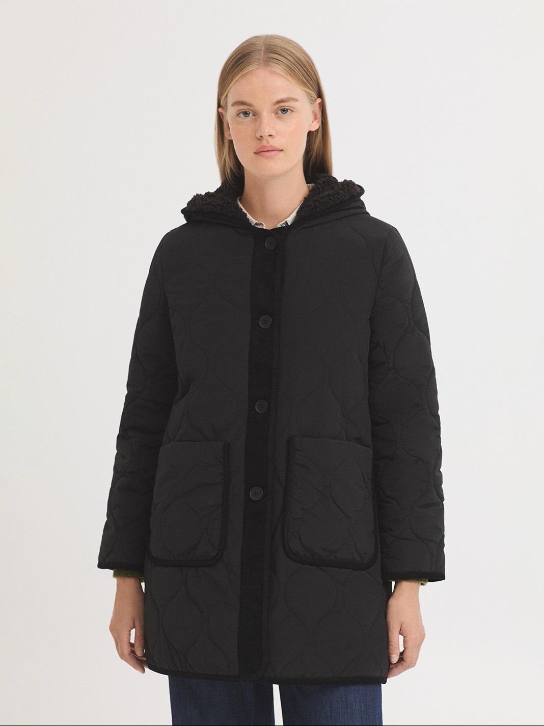 Trench acolchado en tejido mezcla de nailon repelente al agua. Tapeta y vivos en micropana. Capucha, botonadura frontal y bolsillos de parche. Forrado con borreguito.