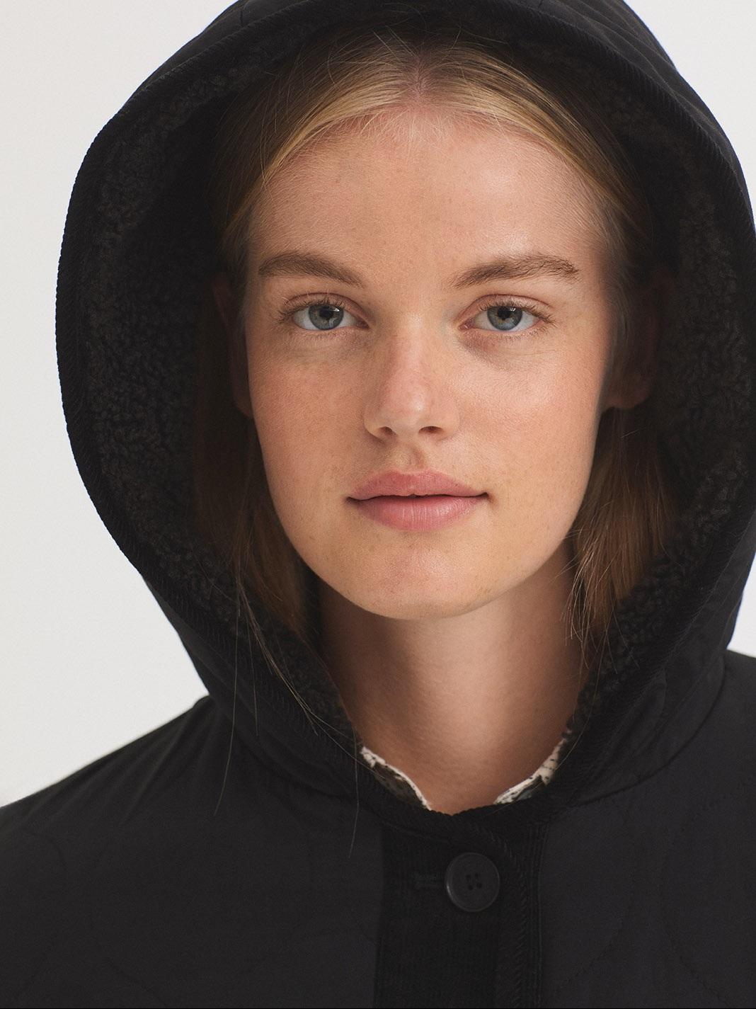 Forro interior de borrego en cuerpo y capucha, y acolchado de nailon en manga.