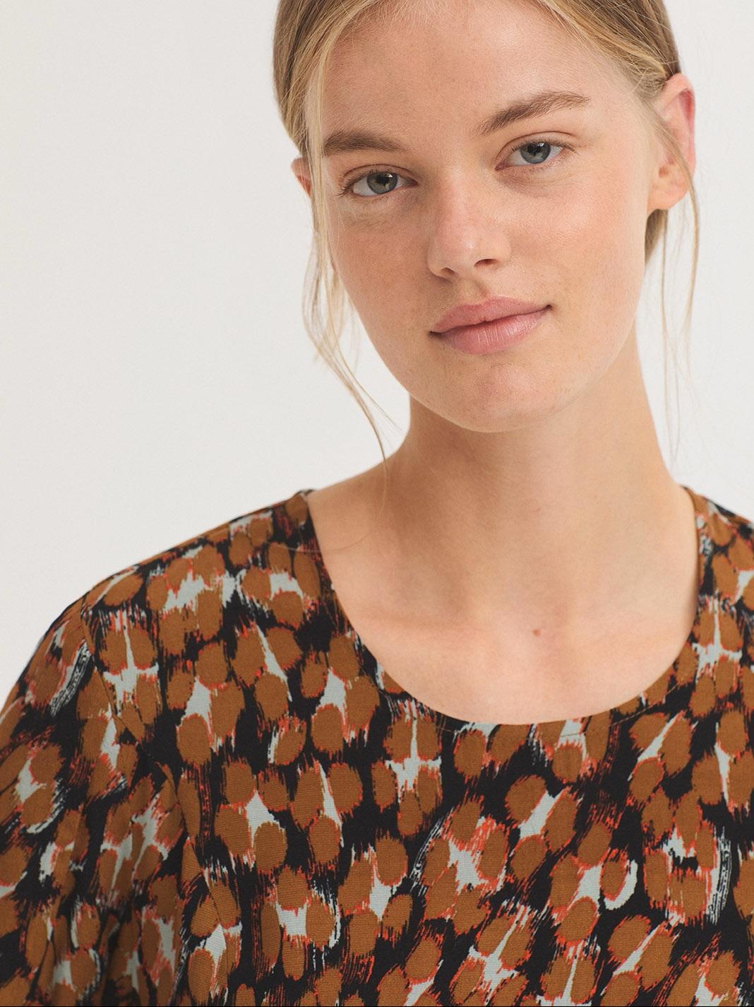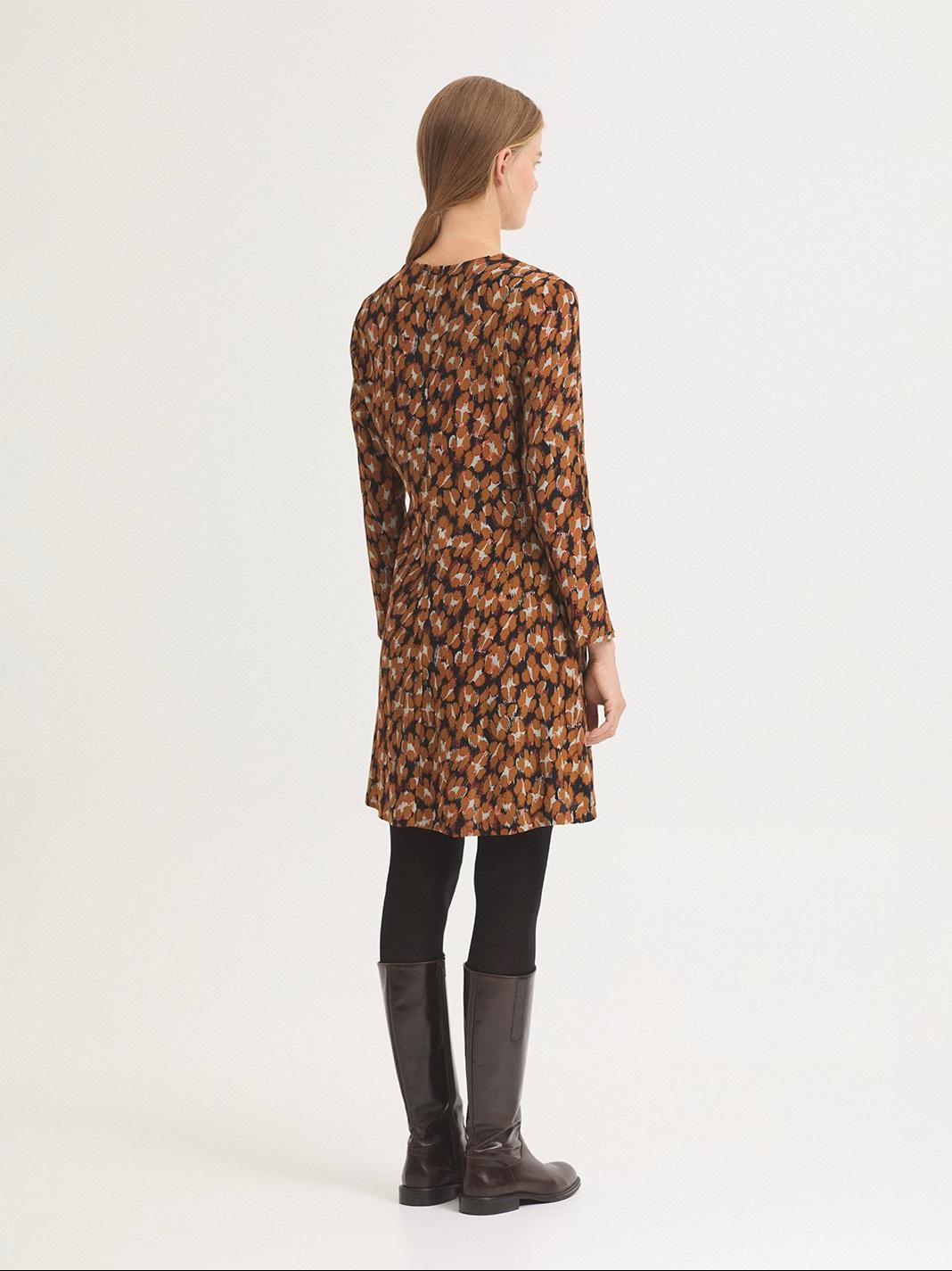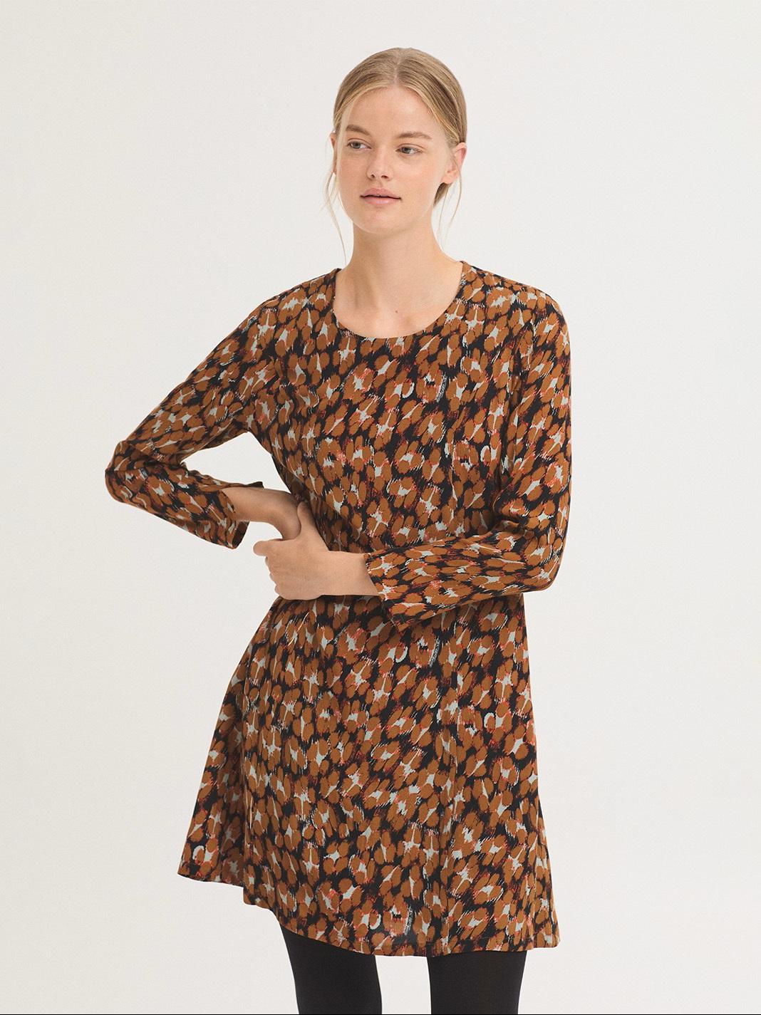 Vestido en crepé de viscosa con estampado Leopard. Escote redondeado y costadillos laterales. Manga con pequeña abertura en el bajo. Bolsillos. Cremallera invisible en parte trasera. Fitting evasé.
