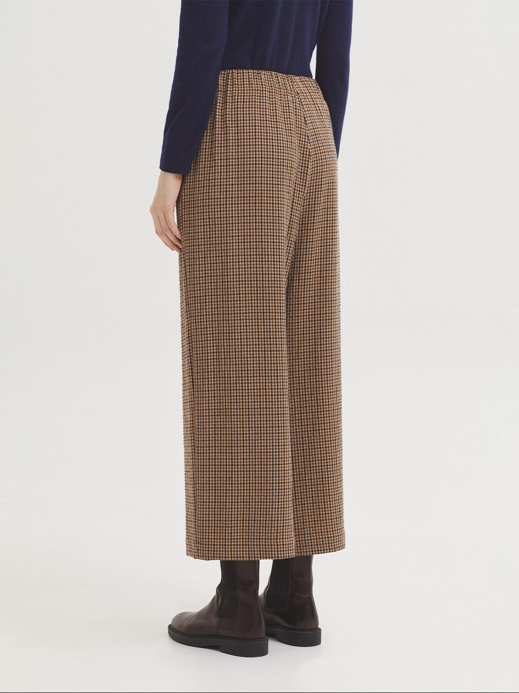 Pantalón en tejido de cuadros efecto arrugado. Cinturilla con goma interior. Bolsillos laterales. Pierna ancha.