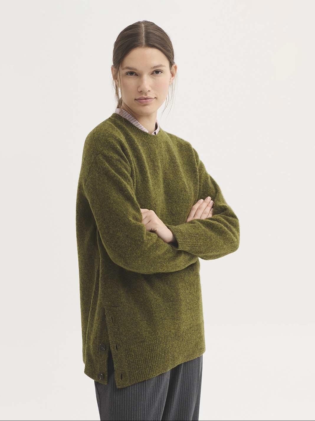 Jersey de lana Lambswool con cuello redondo, manga larga, detalle de botones en el lateral y acabados en rib.