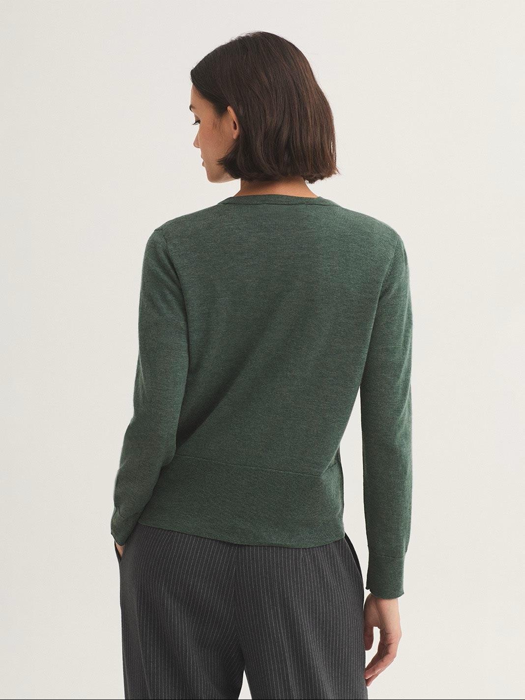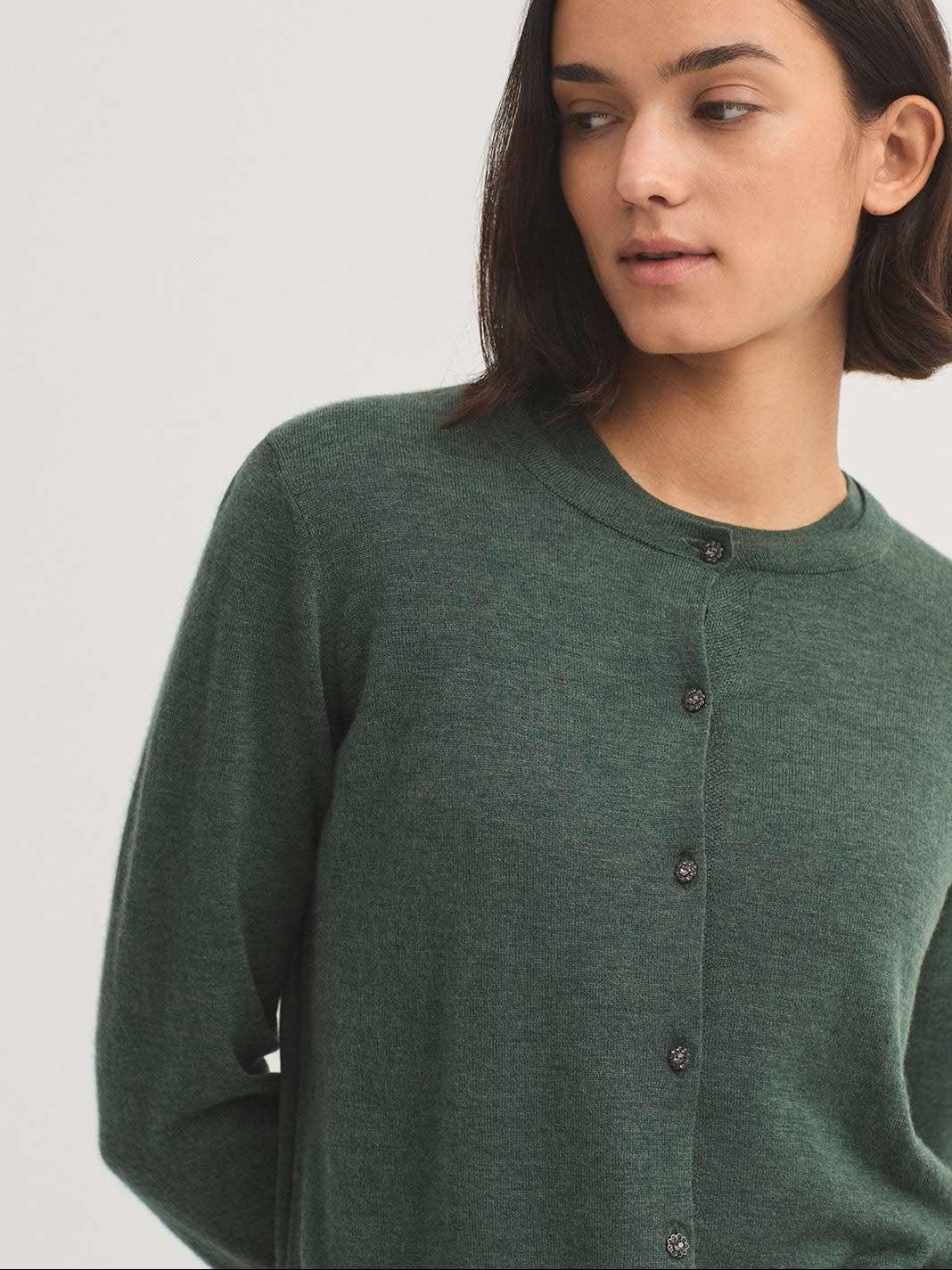 Chaqueta básica en lana merino con botones joya. Cuello redondo, manga larga y acabados en rib.