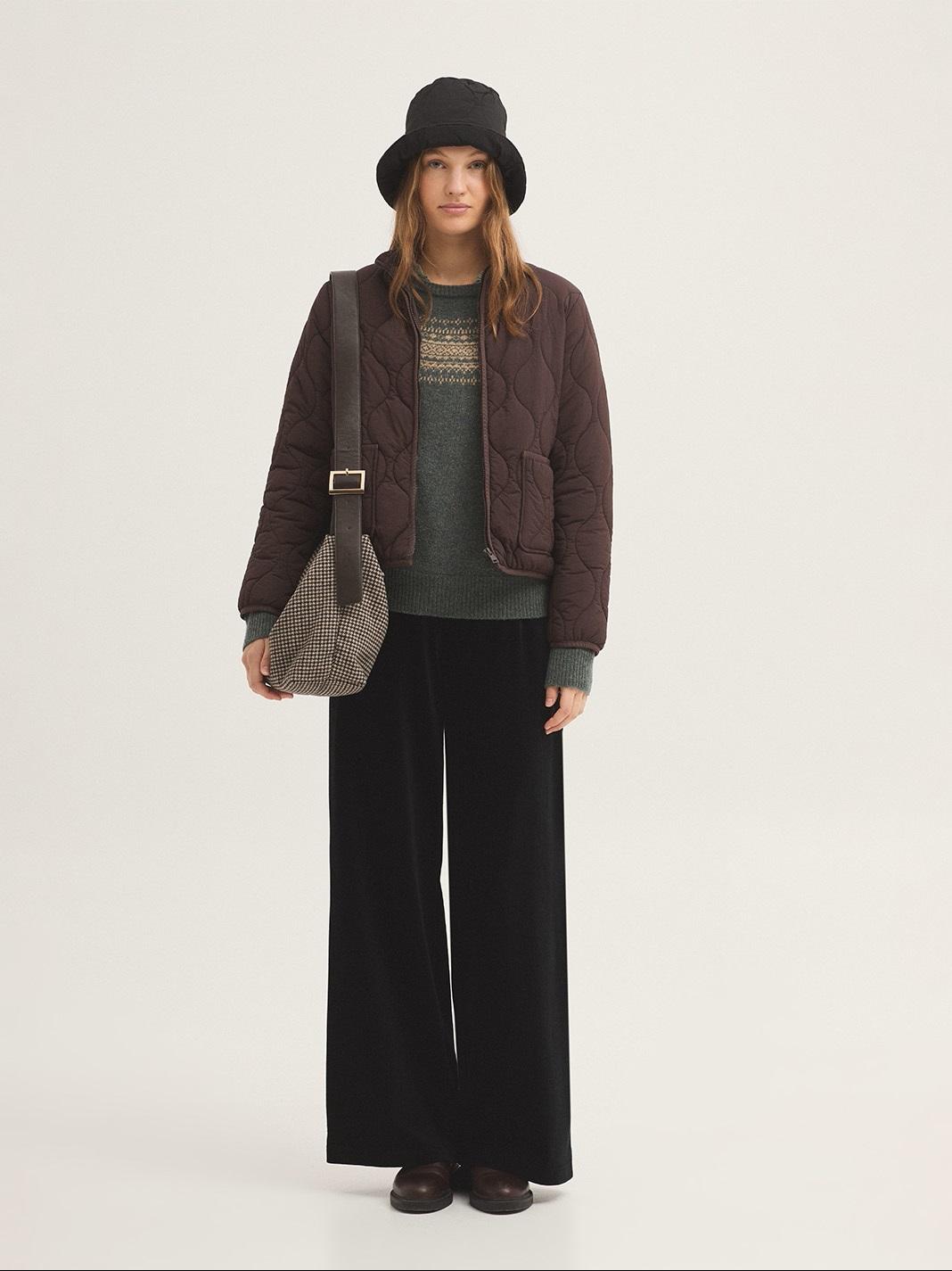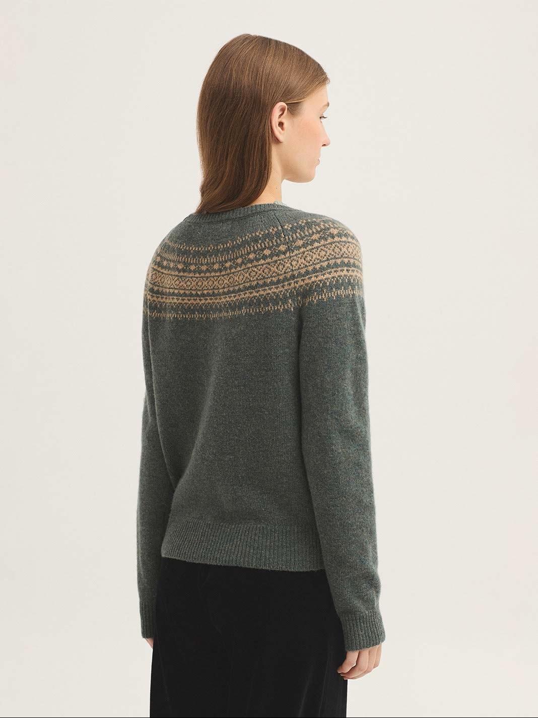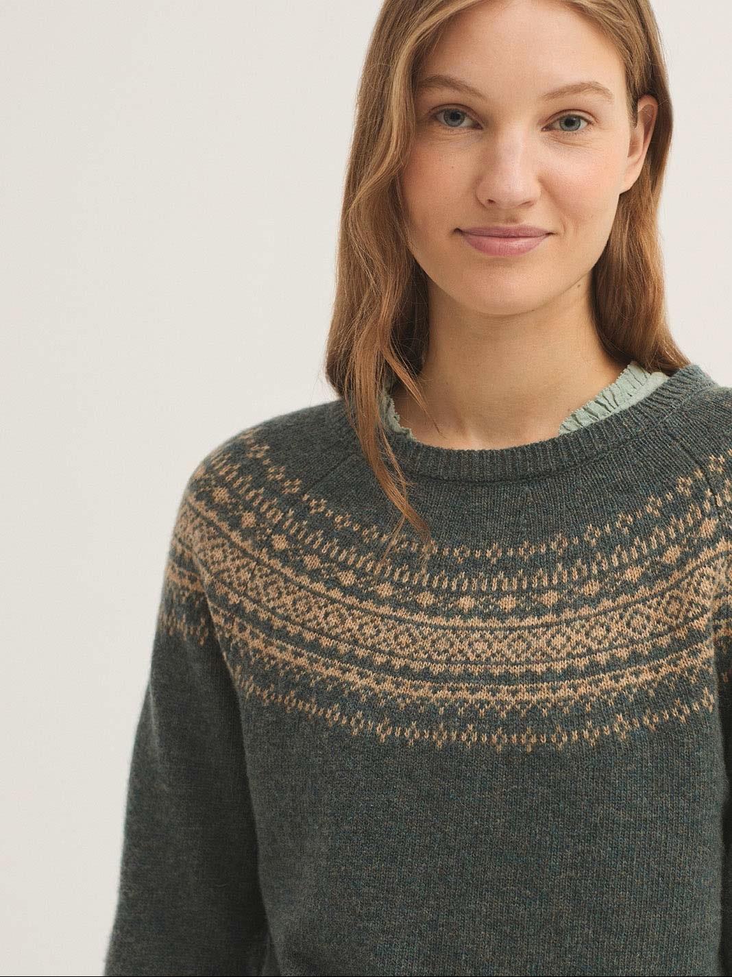 Jersey de lana con cuello redondo y detalle de greca en jacquard. Manga raglán y acabados en rib.