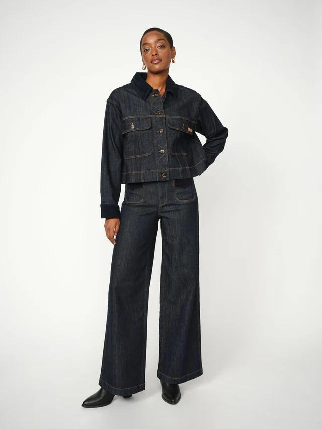Estos elegantes vaqueros de talle alto tienen un favorecedor corte de pierna ancha que ofrece una silueta moderna y atemporal. Las costuras en contraste y el lavado más oscuro en la cintura y los bolsillos delanteros aportan profundidad y un toque vintage muy atractivo. Combínalos con una blusa femenina o un jersey de punto para un look chic sin esfuerzo.