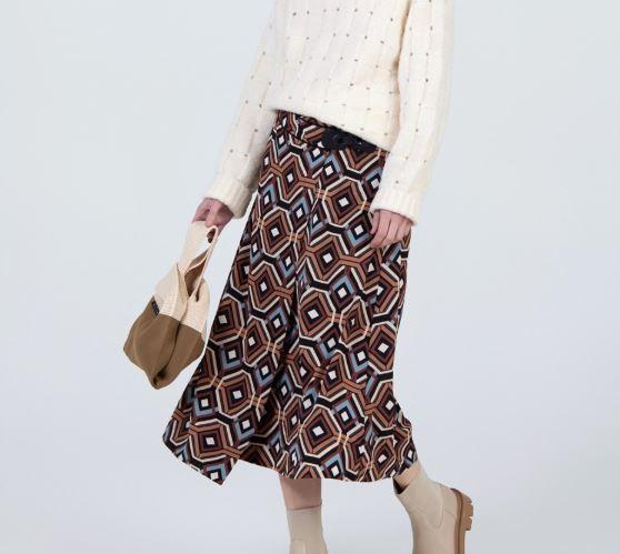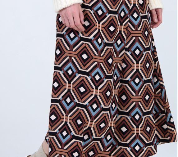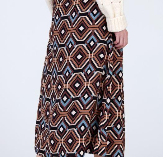 Falda midi cruzada con estampado geométrico. Detalle de la hebilla en el cruce. Cierre con cremallera invisible lateral. Con forro.
