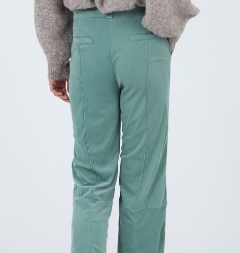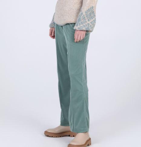Pantalón de pana recto. Cinturiila ancha con detalle de las hebillas. Cierre frontal con gancho. Abertura en el bajo con cremallera invisible.
