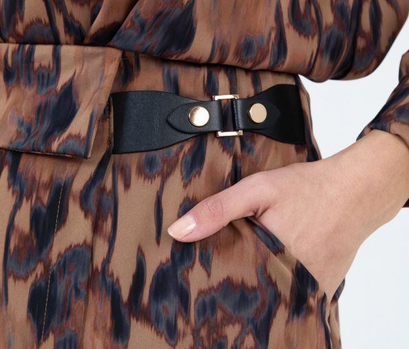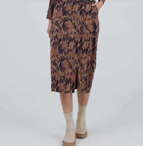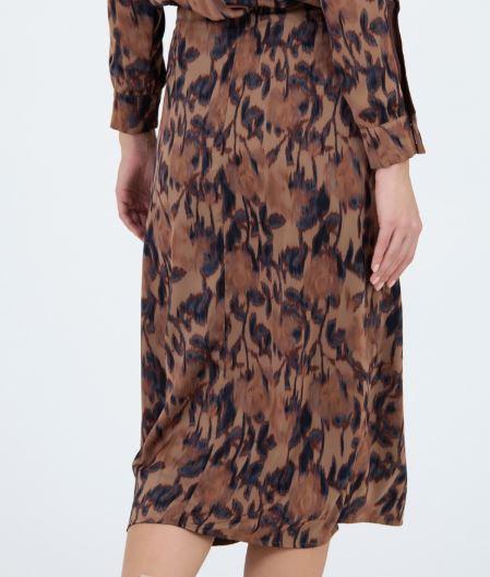 Falda cruzada midi con estampado flores abstractas. Detalle hebilla de cuero en la cinturilla. Cierre en la espalda con cremallera invisible.