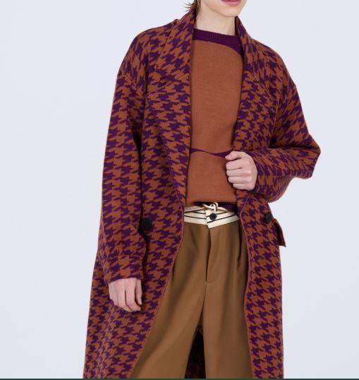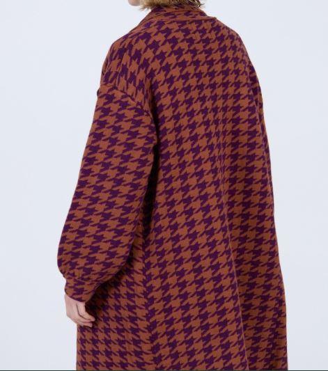 Abrigo de punto con jacquard pata de gallo. Hilo con mezcla de viscosa. Cuello solapa. Manga larga abullonada. Cierre frontal con botones.