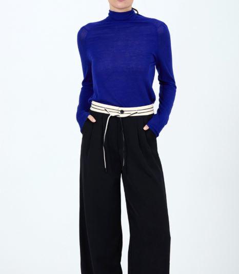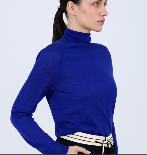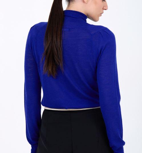 Jersey de punto fino de color liso con mezcla de lana. Cuello cisne. Manga larga abullonada con el detalle de los pliegues en el hombro. Fitting ligeramente ajustado.