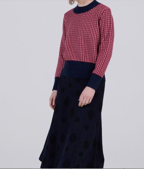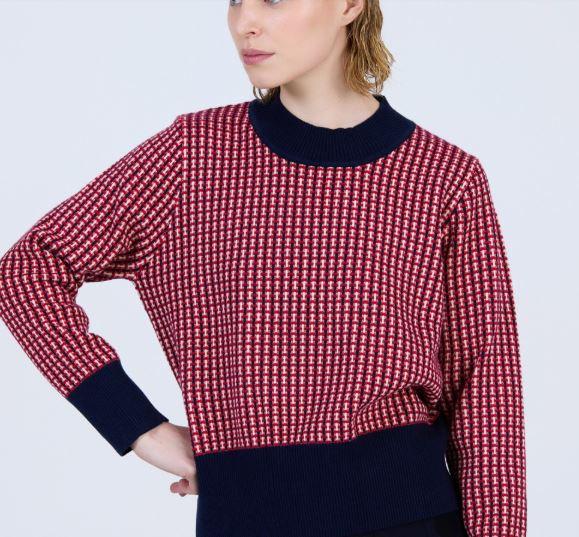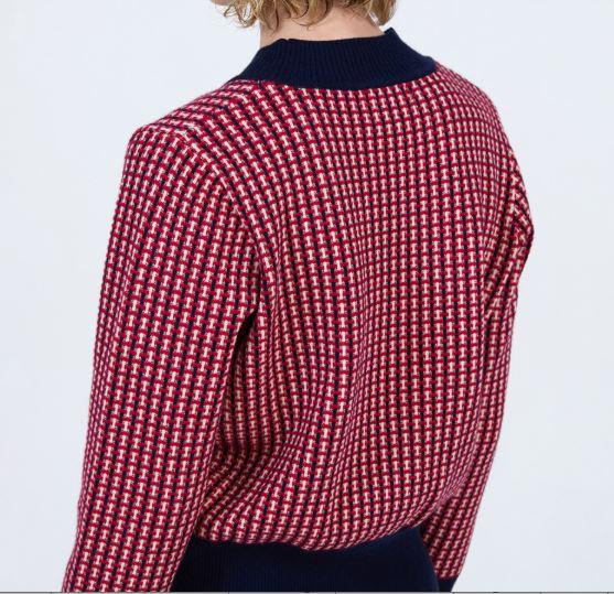 Jersey jacquard tramado con mezcla de viscosa. Cuello redondo. Manga larga. Canalés a contraste.
