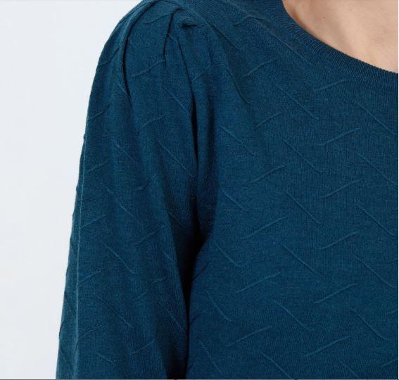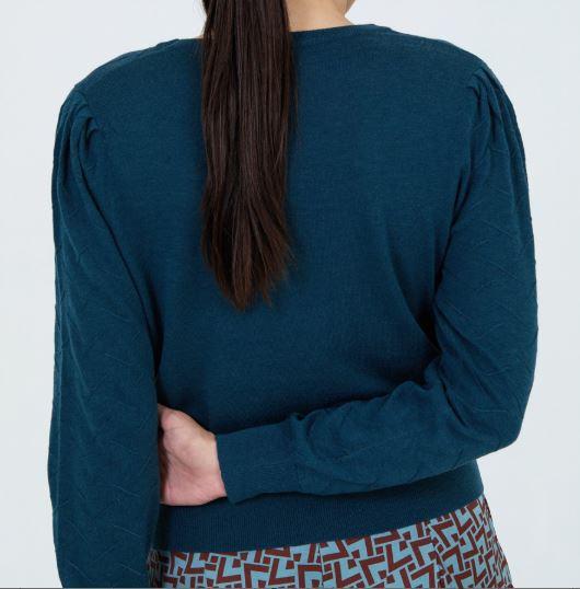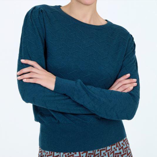 Jersey de punto links con motivo líneas. Hilo con mezcla de lanas. Cuello redondo. Manga larga abullonada con frunce en el hombro.