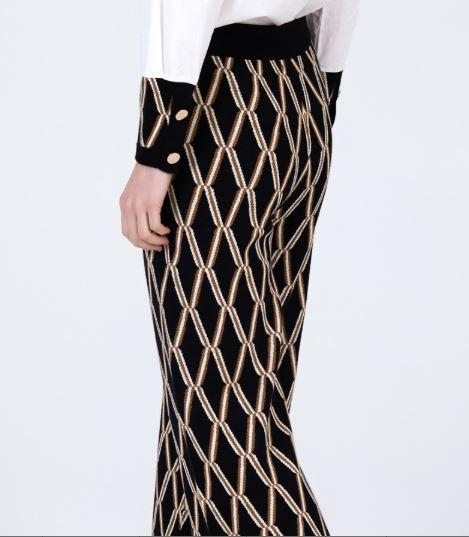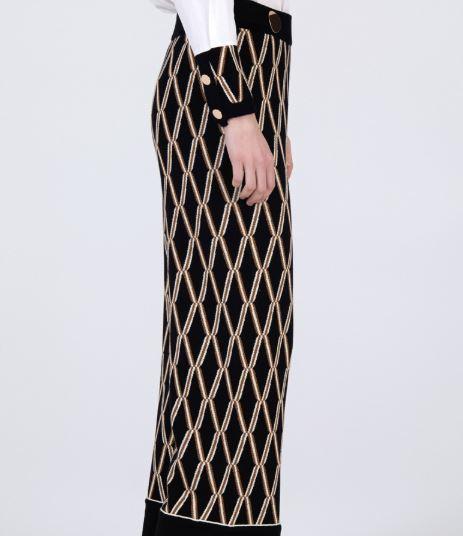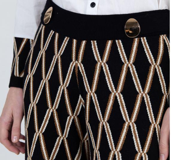 Pantalón con punto jacquard motivo geométrico. Pierna recta. Cinturilla elástica con botones xl dorados. Acabados con canalé a contraste.