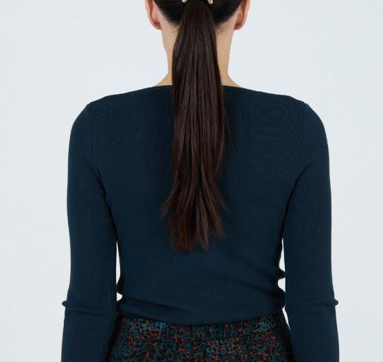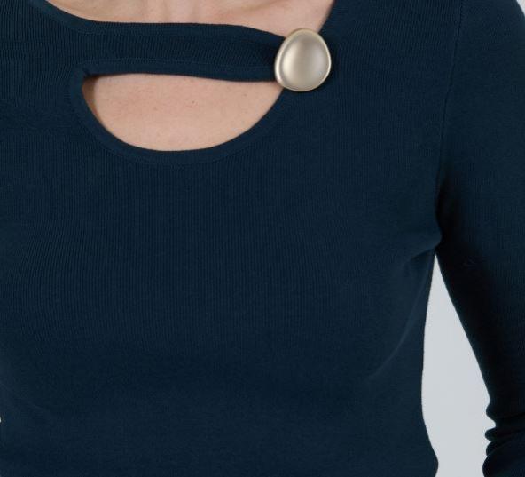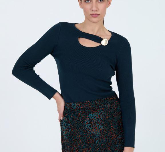 Jersey punto lleno con hilo mezcla de viscosa. Detalle del escote asimétrico con el botón xl. Manga larga. Fitting ligeramente ajustado.