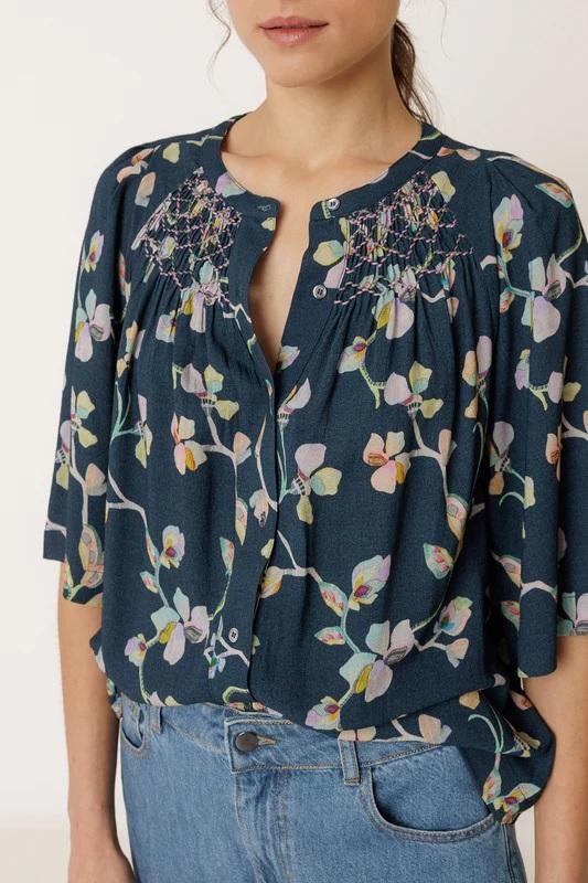 Camisa de viscosa con print de motivo floral. Manga efecto campana con detalles de smock hecho a mano en el canesú y cierre frontal abotonado.