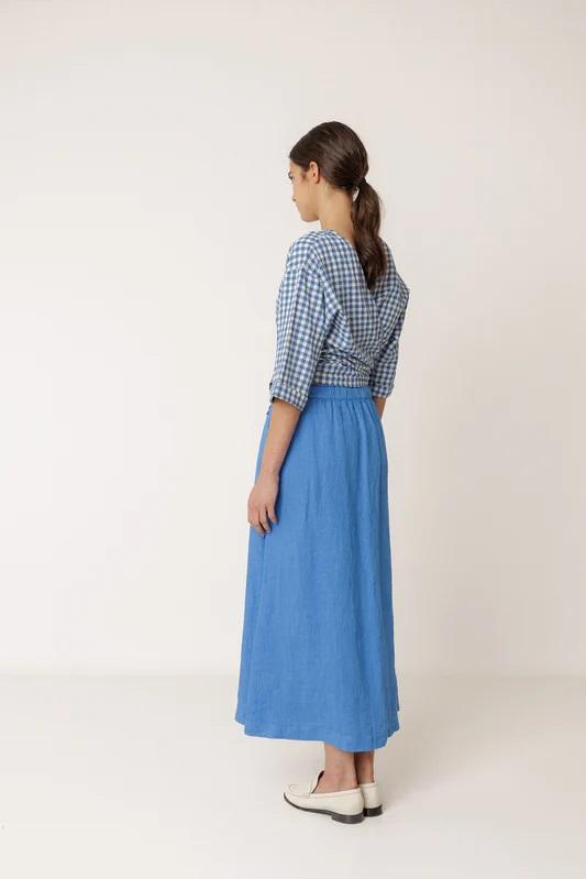 Falda línea A confeccionada en 100% lino. Lleva cintura alta con goma trasera para mayor comodidad y bolsillos ocultos en las costuras laterales. Una prenda cómoda y ligera, perfecta para los días de calor.