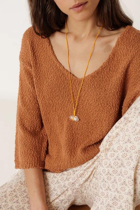 Un jersey básico tejido en bouclé, con escote en V y manga al codo. Confeccionado en un algodón orgánico, resulta muy cómodo por su fit relajado.