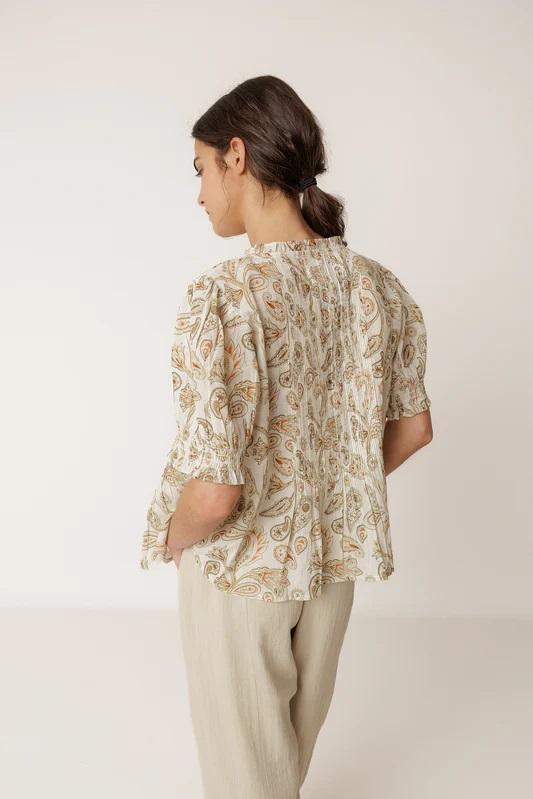 Camisa en voile de algodón orgánico estampada con manga corta y engomada. Escote en pico y micro volante con cierre frontal abotonado y talle trabajado con jaretas. Una pieza especial para la temporada.