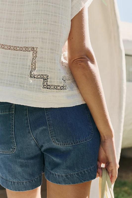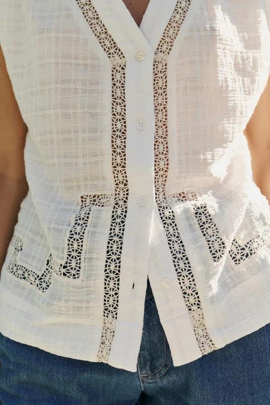 Una blusa ligera y especial gracias a sus detalles de puntilla. Perfecta para elevar un look sencillo con un toque delicado y artesanal.